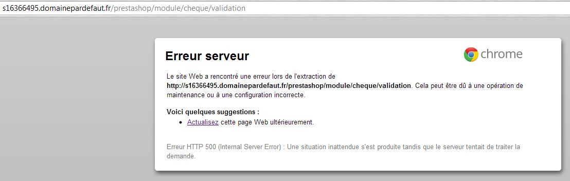 Broceliande Posted October 5, 2012 Share Posted October 5, 2012 Bonjour, Je suis très embêté avec deux détails d'importance pour ma boutique PRESTASHOP. J'ai fouillé partout, sur tous les forums, testé toutes les propositions énoncées pour régler mon problème, mais rien n'y fait. Lorsque je veux payer en chèque ou par virement et que j'arrive à la validation de ma commande j'arrive sur une page blanche erreur http 500 (capture jointe). Svp quelqu'un aurait-il la solution, je suis bloqué et ne peux pas mettre ma boutique en ligne.... Merci d'avance à la communauté et ses experts. Boutique hébergé chez 1and1 OS CentOS 5.8 (Final) Version de Parallels Panel 11.0.9 Mettre à jour #16, dernière mise à jour à Sept 29, 2012 12:23 AM Salut, Tu n'as pas précisé ta version de prestashop ... je présume 1.5 mais 1.5. combien ? L'erreur et ta capture ne suffisent pas pour t'orienter. Si tu veux que l'on se fasse une idée, il va falloir editer le fichier config.inc.php , éditer la ligne : @ini_set('display_errors', 'off'); pour la passer en : @ini_set('display_errors', 'on'); A la place de l'erreur 500 tu auras un joli message d'erreur qui nous aidera peut être, à t'aider Link to comment Share on other sites More sharing options...
