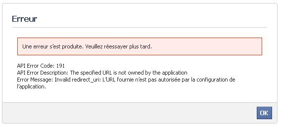 devprestacom Posted January 16, 2013 Author Share Posted January 16, 2013 Bonsoir, Cette erreur signale que vous n'avez pas renseigné le bon url de votre site lors de la création de votre application. Il faut aller modifier l'application en ajoutant l'url : http://creativ-cocci.fr/boutique/ et le domaine : creativ-cocci.fr Merci pour votre confiance. Link to comment Share on other sites More sharing options...