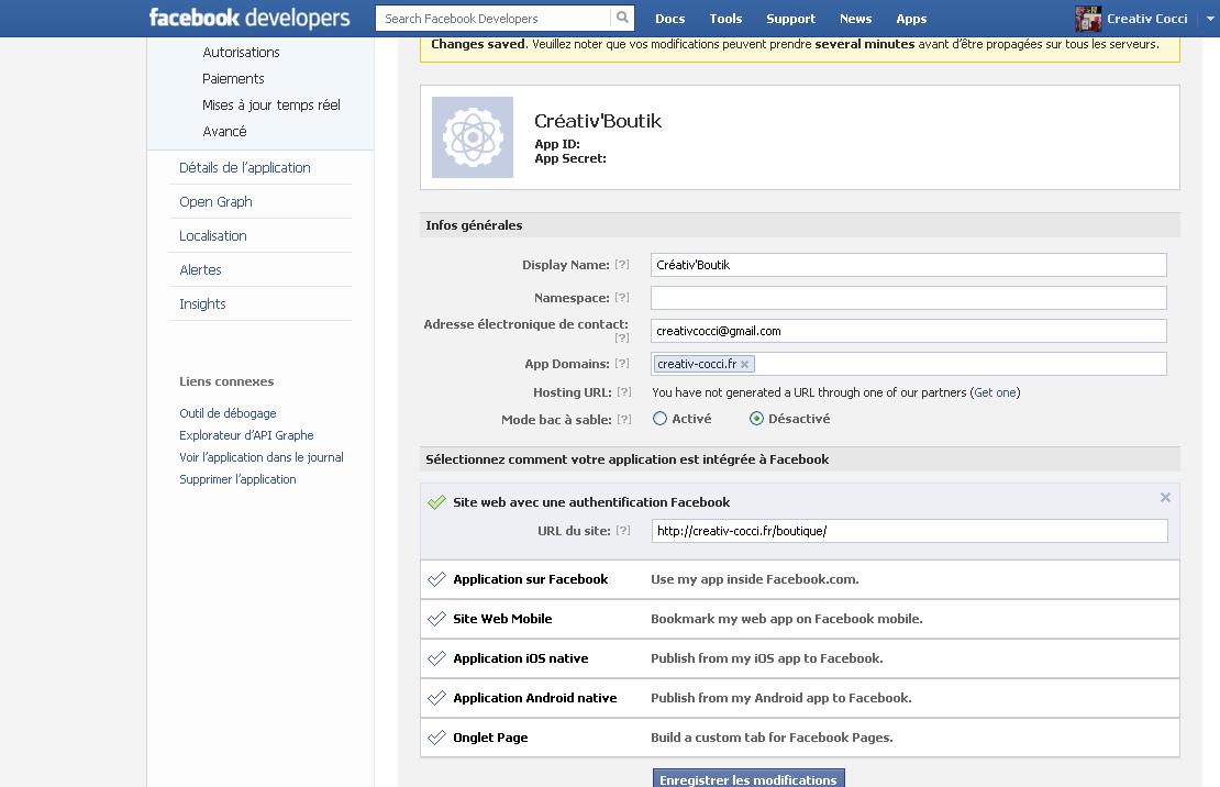 CréativCocci Posted January 17, 2013 Share Posted January 17, 2013 Bonjour, Désolée de vous embêter autant et merci pour votre disponibilité. Avec les infos que vous me donnez, effectivement çà marche, je n'ai plus ce message d'erreur, mais en cliquant sur "se connecter avec facebook" les clients sont redirigés vers mon site et non ma boutique... et ce qui est normal vue la configuration indiquée. En fait, je vous explique la situation : http://creativ-cocci.fr => l'adresse de mon site principal http://creativ-cocci.fr/boutique/ => ma boutique en ligne J'ai cherché comment rediriger cette adresse mais en vain (mes connaissances sont trop "pauvres") La configuration FB ne veut pas de creativ-cocci.fr/boutique/ en url de domaine... et je n'ai pas besoin d'une création de compte sur mon site. Je vous joins une capture d'écran de ma page de paramètres appli FB D'avance merci Valérie Link to comment Share on other sites More sharing options...