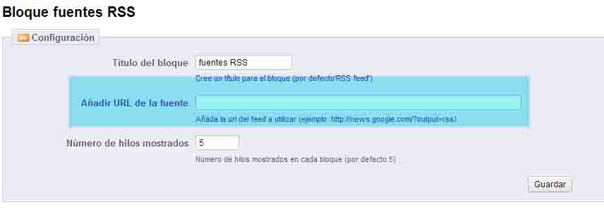 nadie Posted October 3, 2012 Share Posted October 3, 2012 Bloque fuentes RSS ( con opción a configuración) Bloque de Fuente RSS, te permite mostrar los ultimos enlaces a los post del feed que pongas, por ejemplo pon este: http://feeds.feedburner.com/victor-rodenas Y veras que en el lateral te mostrara, los últimos enlaces referente a los post de ese blog. Link to comment Share on other sites More sharing options...