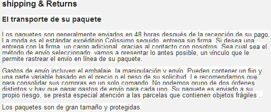 tecknik Posted October 15, 2012 Author Share Posted October 15, 2012 Lo de cms me lo ha puesto nadie: En definitiva: #cms .rte { background:codigo_color; line-height: los pixeles que necesites; text-align:justify; color:colordeltexto; } He puesto esto: #page .rte { background: transparet !important; line-height: 16px; text-align:justify; color: black; } Pero nada. Como compruebo si tiene estilos incrustados de html? Link to comment Share on other sites More sharing options...