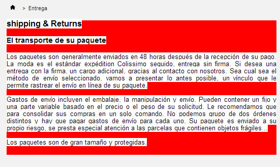 nadie Posted October 15, 2012 Share Posted October 15, 2012 Hola.. Pon lo dentro de.. (Pero todas las instrucciones dentro de lo que te he comentado) #cms .rte {} Pon por ejemplo un background:red !important; Como compruebo si tiene estilos incrustados de html? Vas a la pestaña de los CMS en tu panel de tu tienda, editas el cms y en el editor le das al boton donde dice "html" y si ves que hay algun codigo de color de fondo en alguna parte sea en una celda, o en un div, o en un parrafo o en un span ect.. tienes asignado un fondo... es que tiene un fondo Link to comment Share on other sites More sharing options...
