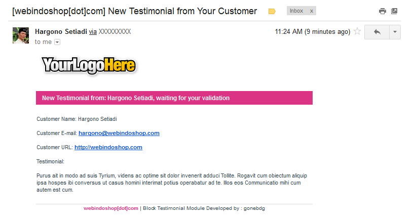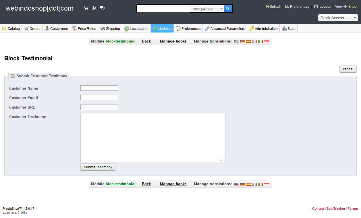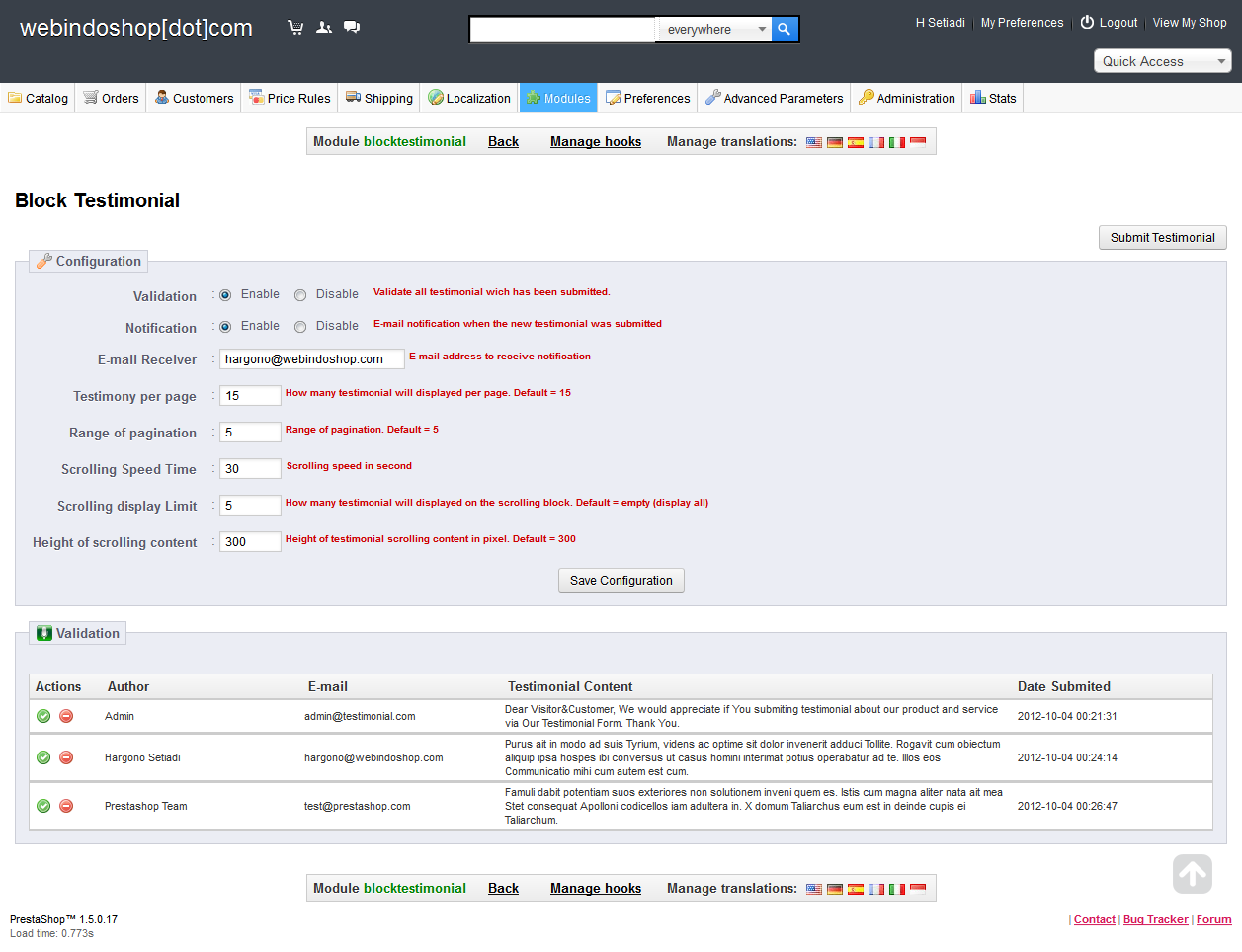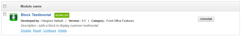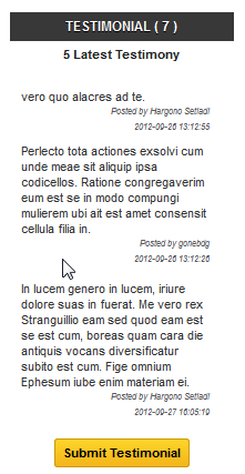 gonebdg - webindoshop.com Posted October 4, 2012 Share Posted October 4, 2012 Block Testimonial Module Version 0.5 Support Prestashop v.1.5.x.x Available in our Store : http://webindoshop.com/prestashop-modul/79-block-testimonial-module.html CHANGELOG blocktestimonial v.0.5 [+] Added compatibility for Prestashop v.1.5.x blocktestimonial v.0.4 [+] Added compatibility for Prestashop v.1.4.x [+] Added Testimony per page option on module configuration [+] Added Range of pagination option on module configuration [+] Added Height of scrolling content option on module configuration blocktestimonial v.0.3 [+] Added View All Testimonial on Submit Testimony Form page [+] Added pagination [+] Using a new scrolling technique for better performance [+] No empty space on the scrolling testimonial content blocktestimonial v.0.2 [*] Improvement has been made to template file. Pure Smarty [+] Front Office Testimonial Form with mail notification (for administrator/ Moderator) [+] Validation upon new testimonial [+] Scrolling testimonial content [+] Manual submit testimonial form in configuration page (Back office) [+] easy validate Testimonial in module configuration page (Back office) blocktestimonial v.0.1 First Released 2 Link to comment Share on other sites More sharing options...