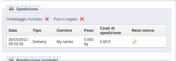 viger Posted May 16, 2013 Author Share Posted May 16, 2013 Ciao, sto iniziano adesso a fare un e-commerce con prestashop, ho la vers 1.5.4 e ho notato l'errore "reso merce" al posto di "tracking spedizione " nel BO nel dettaglio ordine dove inserire il numero spedizione. Questo l'ho corretto tramite file admin.php. Però adesso lo stesso problema mi si ripresenta nel dettaglio ordine dell'account che compra la merce, il numero di spedizione esce sotto la voce "RESO MERCE" anche al cliente. Come faccio a cambiarlo?? Grazie Ciao, scusa il ritardo ma poco tempo per PS forum... :-( Hai ragione, è sopravvissuto anche questo "reso merce". Per tradurlo, senza andare a scomodare la modifica del file admin.php, vai nel BO Localizzazione>Traduzioni>Traduzioni Front Office e ovviamente clicca la bandiera italiana. Tramite il browser cerca "order-detail" (ctrl+F di solito). Qui vedrai il capolavoro di traduzione "tracking number" in "reso merce". Correggilo, salva ed è fatto. Link to comment Share on other sites More sharing options...