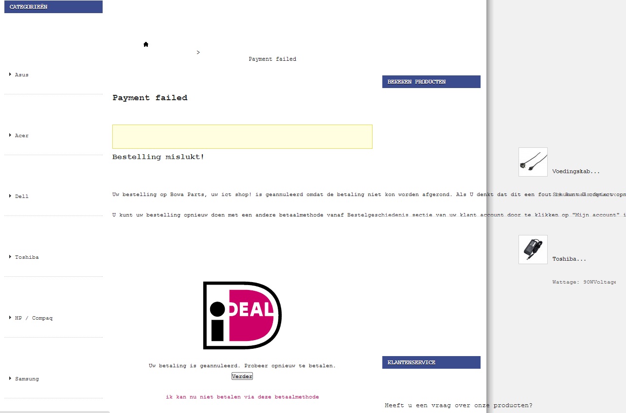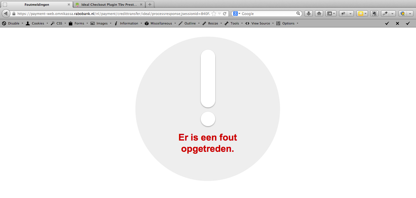 fsve Posted November 12, 2013 Share Posted November 12, 2013 Hoi Scorpionsworld, Na je laatste update werkt de iDeal betaling stabiel, maar ben ik nu wel een nieuwe bug tegen gekomen. Wanneer iemand bij stap twee van het bestellen een comment invult (de stap waar de afleveradressen staan) wordt de betaling WEL uitgevoerd, maar krijgt de gebruiker een foutmelding van de omnikassa. Ook blijft de status in prestashop staan op "wachtend op ideal betaling", terwijl de betaling wel succesvol is gedaan. De gebruiker blijft staan op een foutmelding pagina van de omnikassa en gaat niet terug naar de webshop. Het is de laatste stap van de betaling. (zie screenshot voor foutmelding) De url waarop hij blijft hangen is de volgende (even geanonimiseerd). https://payment-web.omnikassa.rabobank.nl/nl/payment/credittransfer/ideal/processresponse;jsessionid=XXXXXXXXXXXXXXXXXXXXXXXXXXXXXXXX.YYYYYYYYYYYYYYY?trxid=0000000000000&ec=ZZZZZZZZZZZZZZZZ Link to comment Share on other sites More sharing options...