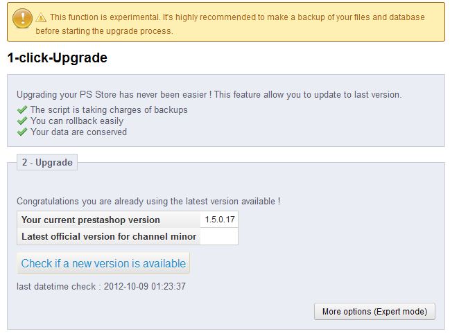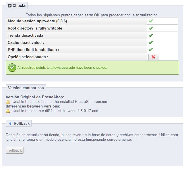 nadie Posted October 8, 2012 Share Posted October 8, 2012 Hola todos para los que tenemos la v1.5.017 y queremos actualizar a al v1.5.1 de una forma sencilla y sin problemassssss................. de que se nos vaya todo al traste? Alguna sugerencia? Lo habeis hecho alguno ya? Saludos a la comunidad Yo he actualizado sin problemas con el auto-upgrade: http://addons.prestashop.com/en/administration-tools-prestashop-modules/5496-autoupgrade.html que lleva Prestashop. Link to comment Share on other sites More sharing options...