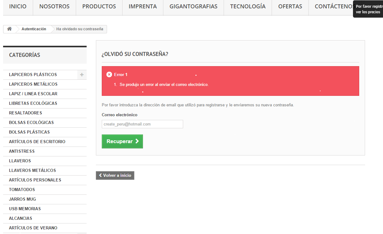Create Publicidad Posted March 29, 2015 Share Posted March 29, 2015 Hola tengo un problema con mi tienda en prestashop tengo la version 1.6 y lo q pasa es que me olvide la contraseña y cuando trato de recuperar me sale error: ¿OLVIDÓ SU CONTRASEÑA? Error 1 Se produjo un error al enviar el correo electrónico. Por favor introduzca la dirección de email que utilizó para registrarse y le enviaremos su nueva contraseña. Correo electrónico Link to comment Share on other sites More sharing options...