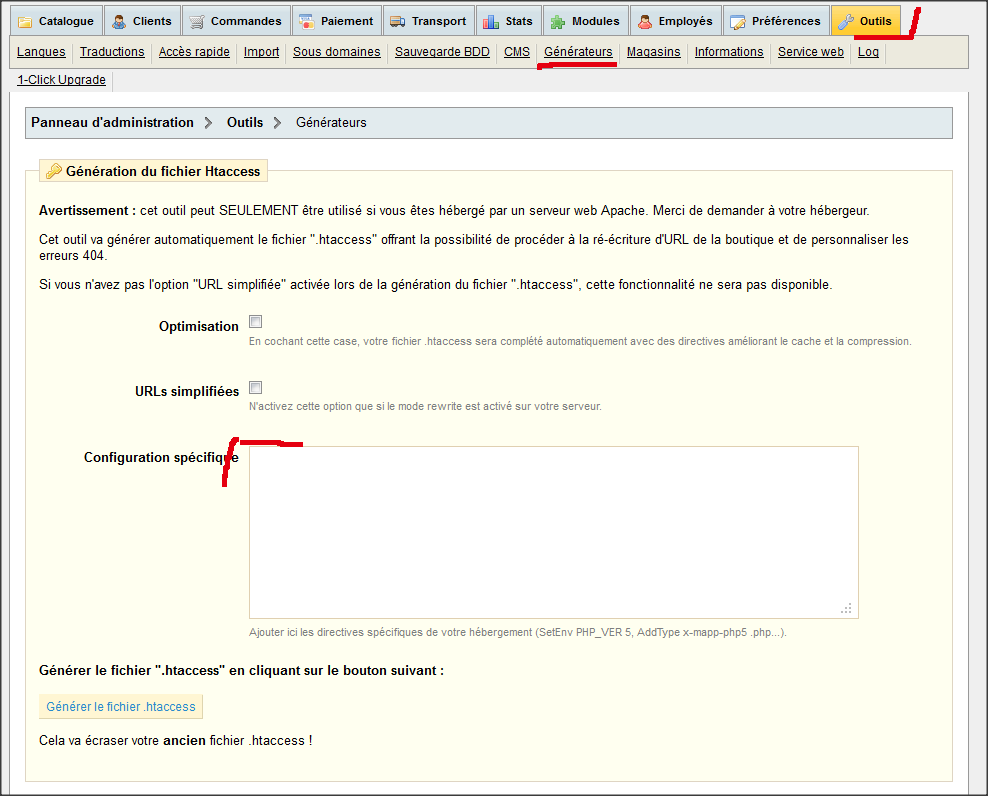 Cyrkam Posted October 11, 2012 Author Share Posted October 11, 2012 Bonjour, Pour repondre a Oron, non je n'ai pas regenéré le .htaccess ! mais comment dois-je faire ? Est ce que le supprimer temporairement réglerai le problème pour pouvoir le régénérer depuis le backoffice ? ou dois je le faire a la main et comment ? Pour répondre a Patrick oui j'ai essayé il me semble mais ca n'a rien changé. Link to comment Share on other sites More sharing options...