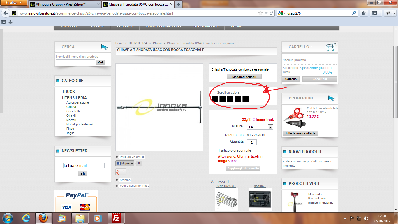 Nel frontoffice invece oltre che al menu a discesa delle varie misure mi esce anche, come si vede in figura, una finestrina con i colori che io non ho assegnato al prodotto.