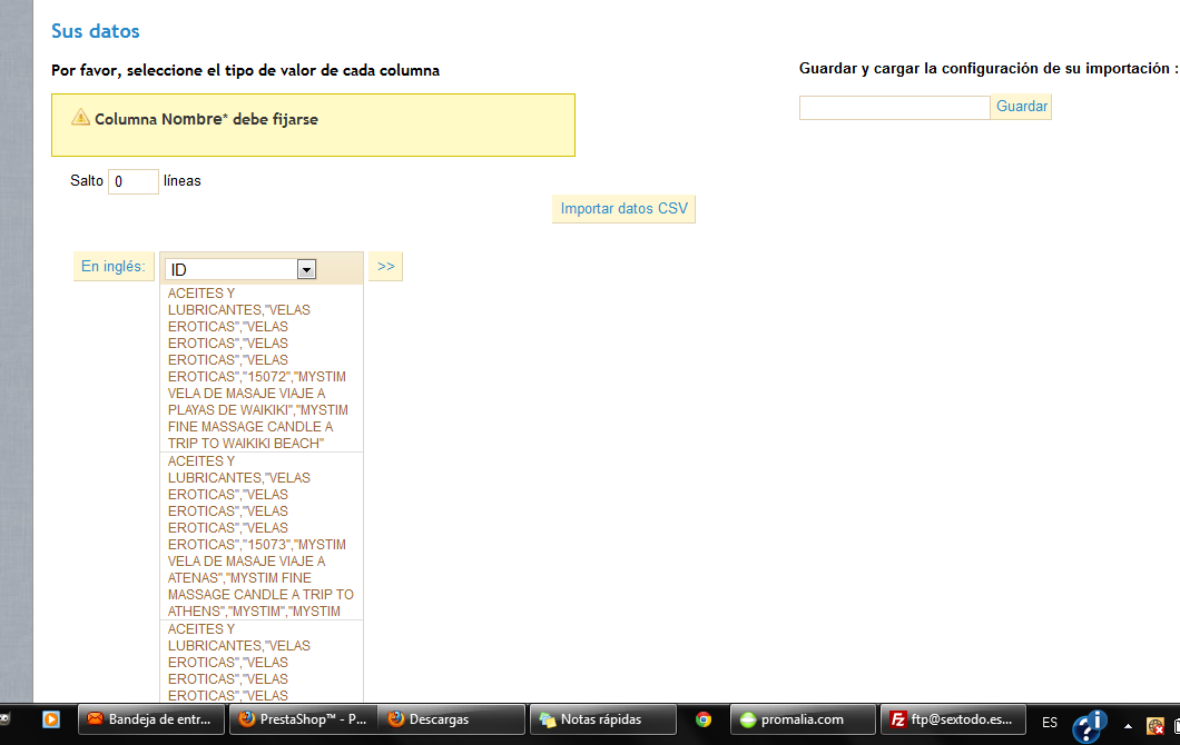 MoisesMurcia Posted October 10, 2012 Share Posted October 10, 2012 (edited) Hola!! tengo un gran problema, tengo carios archivos que me ha dado el proveedor, pero los quiero meter y no se como, a traves del ftp se me salen, pero a la hora de importarlos no me deja. alguien sabe que psa?? Dejo varias capturas, de la pantalla que me sale, de los archivos y de el archivo de productos abierto: Muchas gracias de antemano EDITO: ya lo he solucionado al final he tenido que hacerlo con un xml bien configurdo y pasarlo a csv porque si no no me dejaba pasar los productos Edited October 10, 2012 by MoisesMurcia (see edit history) Link to comment Share on other sites More sharing options...