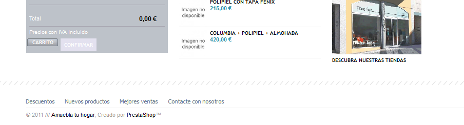 nadie Posted October 16, 2012 Share Posted October 16, 2012 Buenos dias a todos, necesito que alguien me preste un poco de ayuda. Se poquito de programacion y de prestashop y no consigo averiguar como modificar el pie de mi pagina que me aparecen unos enlaces que no quiero que aparezcan ahi, ni como modificar su contenido. Adjunto una imagen para que veais los link a los que me refiero y podais ayudarme. Este es el link de mi página www.amueblatuhogar.es Espero vuestras respuestas, muchas gracias. En tu caso, para quitar los siguientes enlaces del pie de pagina: Descuentos, Nuevos productos, Mejores ventas, Contacte con nosotros, y los dos que tienes debajo. En tu caso, debes editar el fichero: themes/blackwhite/modules/blockcms/blockcms.tpl A partir de donde dice: <!-- MODULE Block footer --> No se te olvide una vez realizada la modificación y guardado los cambios, ir a la pestaña Preferencias -> Rendimiento y señalar Forzar Compilación -> SI, una vez que veas que se han aplicado los cambios lo dejas en "NO" Link to comment Share on other sites More sharing options...