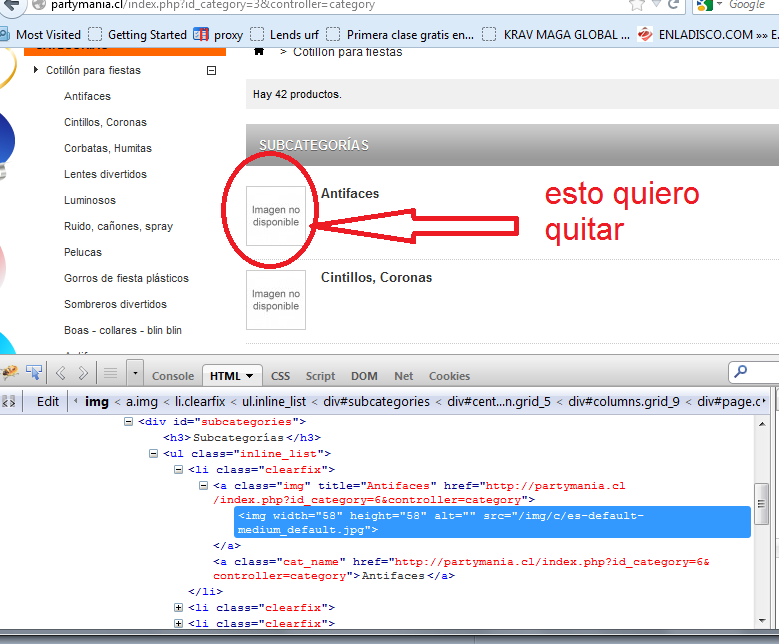 nadie Posted October 18, 2012 Share Posted October 18, 2012 Hola, necesito quitar las miniaturas de la lista de Subcategorías, quiero que aparezca solo el nombre de la subcategoría. Estuve viendo con firebug del firefox qué quitar pero no logro dar con el archivo que tengo que modificar. Uso PS. 1.5 Adjunto un print de pantalla. Muchas gracias! Fichero: /themes/default/category.tpl Busca esto: <a href="{$link->getCategoryLink($subcategory.id_category, $subcategory.link_rewrite)|escape:'htmlall':'UTF-8'}" title="{$subcategory.name|escape:'htmlall':'UTF-8'}" class="img"> {if $subcategory.id_image} <img src="{$link->getCatImageLink($subcategory.link_rewrite, $subcategory.id_image, 'medium_default')}" alt="" width="{$mediumSize.width}" height="{$mediumSize.height}" /> {else} <img src="{$img_cat_dir}default-medium_default.jpg" alt="" width="{$mediumSize.width}" height="{$mediumSize.height}" /> {/if} </a> Y dejalo asi: <!-- <a href="{$link->getCategoryLink($subcategory.id_category, $subcategory.link_rewrite)|escape:'htmlall':'UTF-8'}" title="{$subcategory.name|escape:'htmlall':'UTF-8'}" class="img"> {if $subcategory.id_image} <img src="{$link->getCatImageLink($subcategory.link_rewrite, $subcategory.id_image, 'medium_default')}" alt="" width="{$mediumSize.width}" height="{$mediumSize.height}" /> {else} <img src="{$img_cat_dir}default-medium_default.jpg" alt="" width="{$mediumSize.width}" height="{$mediumSize.height}" /> {/if} </a> --> O simplemente cárgate lo que te he comentado. Link to comment Share on other sites More sharing options...