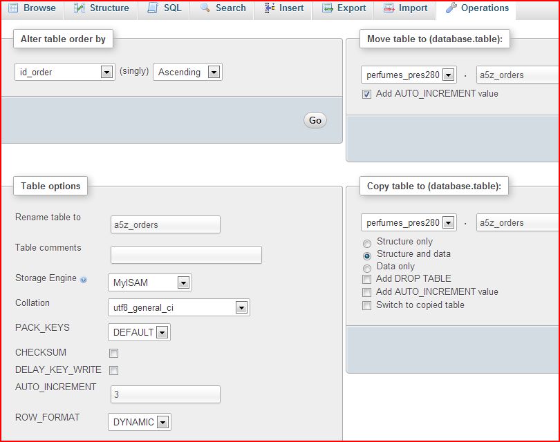 Paulito Posted October 21, 2012 Share Posted October 21, 2012 Good Morning Nate, OK I will try but I am not an expert, so Go back to the page where you found id order ( dbimage1 ) and click on the pencil icon/change You should then be taken to a new page (dbimage2) click on the spanner icon/operations You will then be taken to another page (dbimage3) where you will see auto_increment I assume you change this number Hope this helps Paul Link to comment Share on other sites More sharing options...