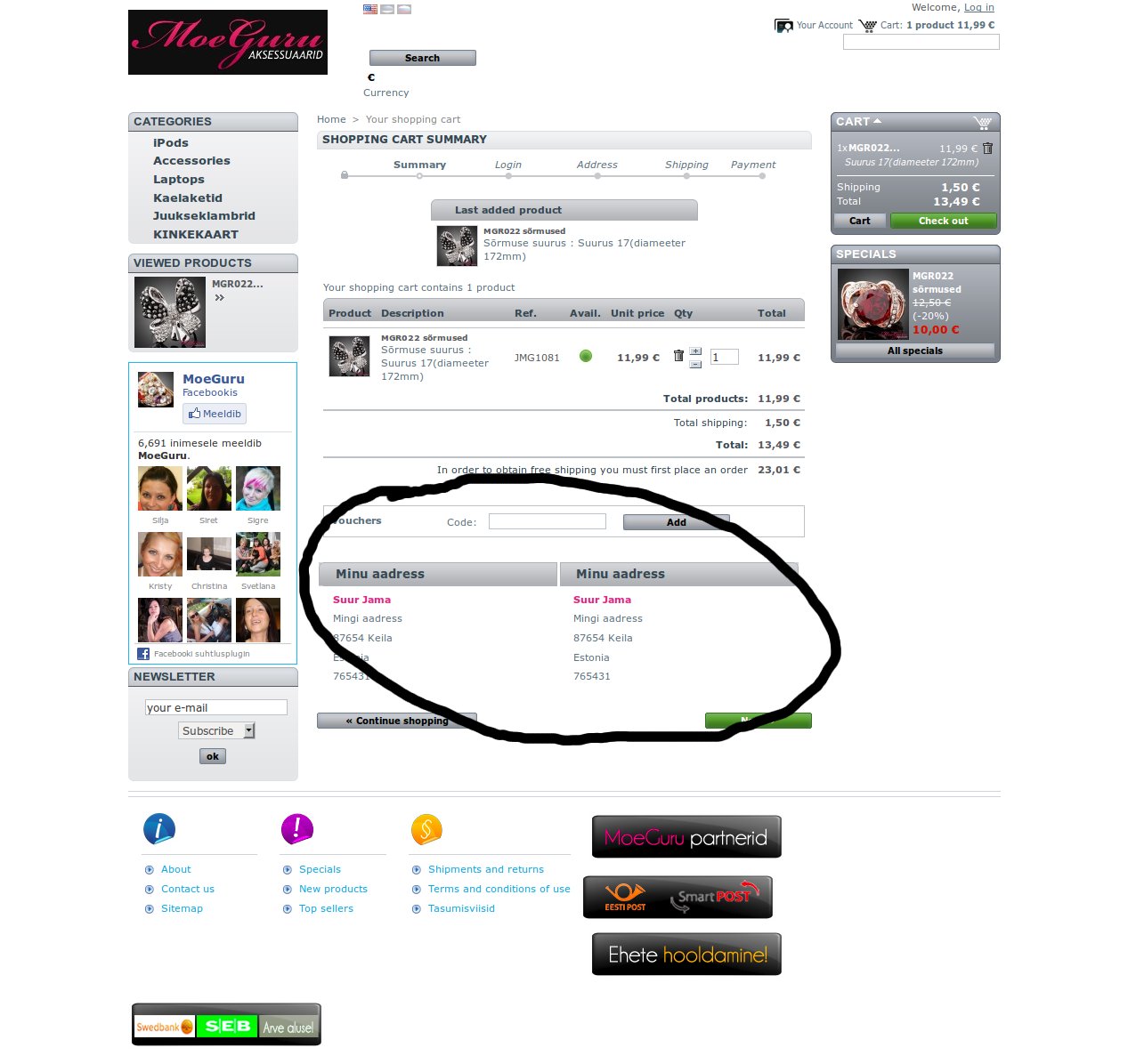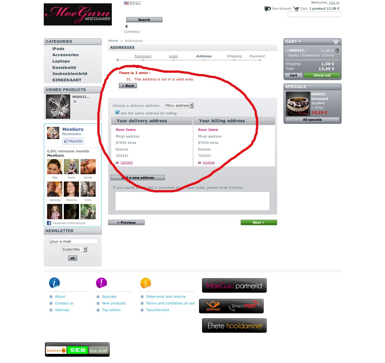 spott Posted October 22, 2012 Share Posted October 22, 2012 Hi I am facing a strange problem. Can some one give a hint - where to look. Is this error related with some database tables or is some file missing? So whats the problem. I am filling all needed information (no mather is it quest checkout, or costumer, or returning costumer). This is step 1 picture Now - when I am pressing Next, at next order step the Address is missing (step 2) When I am pressing then Next, I am getting "This address is not in a valid area" error, but address information is again filled (step 3) After that I can processed with order. This is not theme problem as these pictures I take also with default theme. Please don't give the answers - "check the carriers". This is not related with carriers. Problem is that from one step to other - address information get lost and then it coming back. Can it be database related? I discovered that one upgrade was not fully made (I think 1.4.5 to 1.4.7). But I executed all sql command and filled all needed tables. Right now this store (test store), where we can see this problem running 1.4.9. Original store with 1.4.7 - there is no that problem. Link to comment Share on other sites More sharing options...