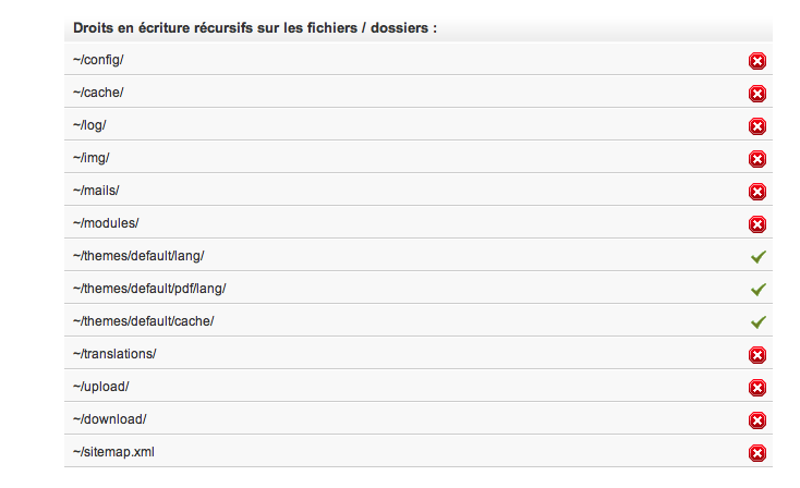 gsoftfrance Posted October 23, 2012 Share Posted October 23, 2012 (edited) Bonjour à tous, Je découvre pas à pas, et j'essaie tant bien que mal d'installer prestashop correctement ( en local pour test) Je suis sous mac (os mountain lion), j'ai installé XAMPP. Voilà j'ai un problème lors de l'installation à l'étape 2 qui m'indique : Votre configuration est invalide. Merci de corriger les problèmes ci dessous : Voici en détails : Je ne sais pas comment faire pour modifier les paramètres "Droits en écriture récursifs sur les fichiers / dossiers " est ce que quelqu'un connait la marche à suivre pour m'aider à valider cette étape ? Par avance merci. Edited October 23, 2012 by gsoftfrance (see edit history) Link to comment Share on other sites More sharing options...
