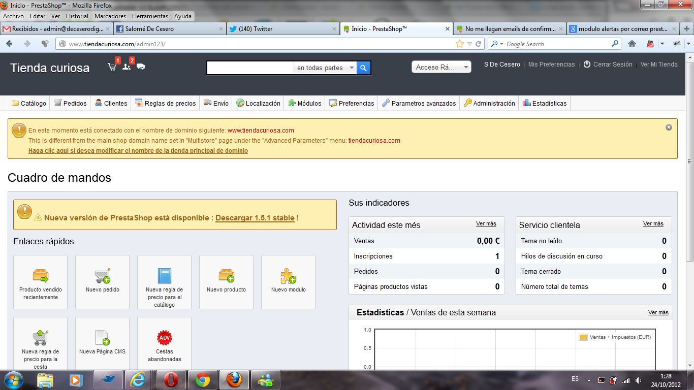 nadie Posted October 24, 2012 Share Posted October 24, 2012 Hola, cuando entro en el administrador de prestashop me sale una alerta rara. La envío adjunto para ver si me podeis decir qué significa y si puede interferir en algo en la importación de archivos o cualquier otra acción. Gracias En la configuración de la multi-tienda, tienes configurado el dominio sin las tres "www" y estas accediendo al back-office con las tres "www". 1 Link to comment Share on other sites More sharing options...