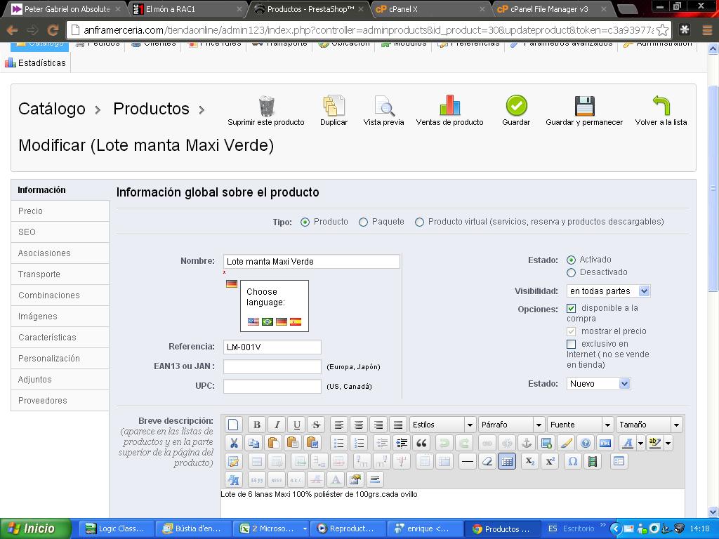 frankwap Posted October 24, 2012 Share Posted October 24, 2012 Acabo de instalar a la versión 1.5.1. y se me han desbaratado los idiomas y banderas (adjunto pantallas) , como podréis ver ahora la bandera francesa es el español y la bandera española el catalán pero la bandera ha desaparecido y sale la portuguesa que no está activa??...temia que iba a pasar algo con la actualización... Os agradezco de antemano vuestra ayuda! Saludos, Link to comment Share on other sites More sharing options...
