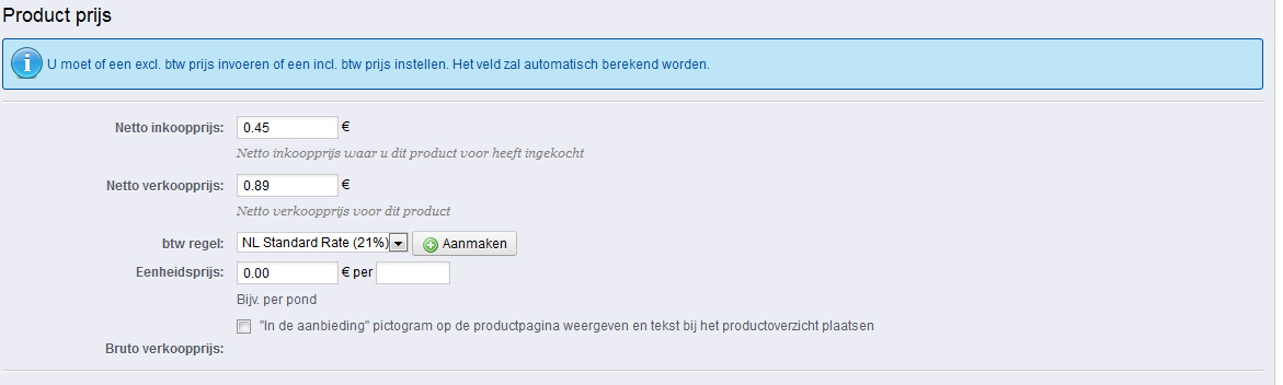 Lucif Posted October 24, 2012 Share Posted October 24, 2012 (edited) Ik wil graag bij het invoeren van een product de netto (excl btw) prijs opgeven en als verkoopprijs de inclusief btw prijs. Zodat hij zelf de exclusief btw prijs berekend. Maar, volgens mij gaat dat niet. Ik kan de netto inkoopsprijs en de netto verkoopsprijs invoeren. Hoe kan ik de bruto verkoopprijs invoeren? Zie ook bijlage Edited October 24, 2012 by Lucif (see edit history) Link to comment Share on other sites More sharing options...