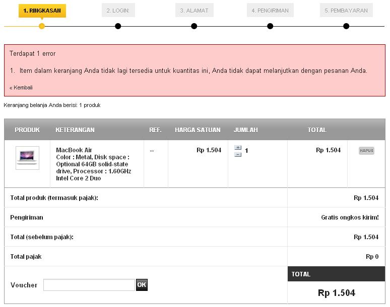 Ecam Posted October 26, 2012 Author Share Posted October 26, 2012 (edited) oh iya, lupa tambahin. Stok msh belasan qty nya, diorder 1 pun keluar pesan tersebut. "Allow ordering of out-of-stock productS" sdh di Yes. Bingung. Apa perlu ada yg dicek di database ya? sebelah mana? Coba bedah /controllers/front/OrderController.php, ada seperti ini : global $orderTotal; parent::init(); $this->step = (int)(Tools::getValue('step')); if (!$this->nbProducts) $this->step = -1; // If some products have disappear if (!$this->context->cart->checkQuantities()) { $this->step = 0; $this->errors[] = Tools::displayError('An item in your cart is no longer available in this quantity, you cannot proceed with your order.'); Saya coba dengan product bawaan dr Prestashop (MacBook Air), jg muncul pesan yang sama. Ada saran? Edited October 27, 2012 by Ecam (see edit history) Link to comment Share on other sites More sharing options...