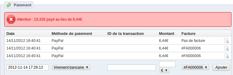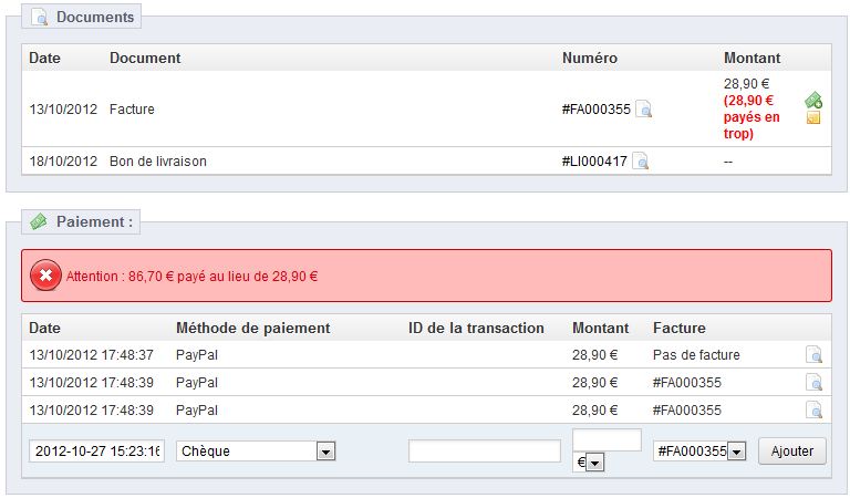 pioudkp Posted October 27, 2012 Share Posted October 27, 2012 (edited) Bonjour, Je rencontre un problème avec le module paypal (maintenant en Version 3.2.5) depuis que je suis passé en 1.5.1 et 1.5.2. Mon problème perdure et concerne environ 2 commandes sur 3, je n'ai jamais eut ce problème avec les versions antérieures. L'image parle d'elle même, un client doit me payer par exemple 30€, mais dans le back office, on me dit (60 € payés en trop) dans documents, et dans le récapitulatif j'ai : Attention : 90 € payé au lieu de 30 € et le paiement apparaît plusieurs fois. Après vérification sur paypal, je ne reçois qu'une fois la somme de 30€ donc ça va, sauf que dans les factures, il y a 2 règlements Paypal et les clients prennent peur et perdent confiance. Est-ce que quelqu’un rencontre ce problème ? Existe t'il une solution ? Merci d'avance. Edited October 27, 2012 by pioudkp (see edit history) Link to comment Share on other sites More sharing options...