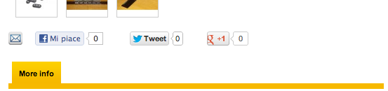 viger Posted October 29, 2012 Share Posted October 29, 2012 (edited) Ciao a tutti! Sempre a causa della versione 1.5.0.17, i moduli che avevo provato nell 1.4.9 non vanno più e, tra questi, due ottimi che mi permettevano di inserire in 2 minuti i pulsanti "mi piace" e "G+" belli puliti e perfettamente posizionati. Visto che un update è, purtroppo, ben lungi da venire, e non essendo io in grado di scrivere un modulo, riporto qui il cambio di codice per posizionare i pulsanti nella pagina prodotto. I pulsanti sono: invia a un amico (mailto) facebook mi piace twitter G+ Ho eliminato il pulsante "stampa" che credo, personalmente, di non aver mai usato in vita mia. Ho invece aggiunto il pulsante "invia" che mi pare ben più comodo (e non vedo perché doverlo installare con un modulo addirittura!). Il posizionamento risulta come da immagine allegata: Sì lo so, in caso di aggiornamento, ecc ecc. Ma perché aggiornare? Se funziona, deve essere per forza riparato? Sinceramente ogni nuova versione ha bug e problemi in abbondanza, perché andare a cercarsi rogne? Quindi io ho fatto così, voi... decidete! NB: faccio riferimento solo al tema di default Aprire il file /themes/default/product.tpl cercare <!-- usefull links--> selezionare poco dopo (riga 215 nella 1.5.0.17) <li class="print"><a href="javascript:print();">{l s='Print'}</a></li> sostituire con <!-- <li class="print"><a href="javascript:print();">{l s='Print'}</a></li>--> <!--inizio bottoni sociali--> <!--mail button--> <li class="bottoni_sociali" style="padding-right: 15px;"><a href="mailto:?SUBJECT={$product->name}&BODY={$link->getProductLink($product)}"><img src="{$img_dir}icon/mail.jpg"></a></li> <!--facebook button--> <li class="fb_right_pad"><div id="fb-root"></div> <script type="text/javascript">(function(d, s, id) { var js, fjs = d.getElementsByTagName(s)[0]; if (d.getElementById(id)) return; js = d.createElement(s); js.id = id; js.src = "//connect.facebook.net/it_IT/all.js#xfbml=1"; fjs.parentNode.insertBefore(js, fjs); }(document, 'script', 'facebook-jssdk'));</script> <div class="fb-like" data-send="false" data-layout="button_count" data-width="450" data-show-faces="false"></div></li> <!--twitter button--> <li class="bottoni_sociali"><a href="https://twitter.com/share" class="twitter-share-button" data-size="medium">Tweet</a> <script type="text/javascript">(function(d, s, id) { var js, fjs = d.getElementsByTagName(s)[0]; if (d.getElementById(id)) return; js = d.createElement(s); js.id = id; js.src = "//platform.twitter.com/widgets.js"; fjs.parentNode.insertBefore(js, fjs); }(document, 'script', 'twitter-wjs'));</script></li> <!--googleplus button--> <li class="bottoni_sociali"><div class="g-plusone" data-size="medium"></div> <script type="text/javascript"> (function() { var po = document.createElement('script'); po.type = 'text/javascript'; po.async = true; po.src = 'https://apis.google.com/js/plusone.js'; var s = document.getElementsByTagName('script')[0]; s.parentNode.insertBefore(po, s); })(); </script></li> <!--fine bottoni sociali--> aprire il file /themes/default/css/product.css cercare /* link list */ #usefull_link_block { list-style-type:none; margin-top: 20px } #usefull_link_block li {padding:2px 0;} #usefull_link_block li.print { padding-left:20px; background:url(../img/icon/print.gif) no-repeat 0 0; } #usefull_link_block li.sendtofriend { padding-left:20px; background:url(../img/icon/send_friend.gif) no-repeat 0 0; } #usefull_link_block li#left_share_fb{ padding-left:20px; background:url(../img/icon/picto_fb.png) no-repeat 0 0; } sostituire con /* link list */ #usefull_link_block { width: 500px; padding-top: 10px; } #usefull_link_block ul { list-style-type:none; } #usefull_link_block .bottoni_sociali { display: inline-block; vertical-align: top; } #usefull_link_block .fb_right_pad { padding-right: 35px; display: inline-block; vertical-align: top; } Caricare l'immagine seguente nella directory /themes/default/img/icon/mail.jpg: Per visualizzare il risultato, ricordarsi, da BO, di settarre l'obbligo di compilazione nella scheda performance! Buon lavoro! EDIT: non so a voi, ma a me cliccando sul thumbnail delle immagini mi si apre sempre un riquadro bianco. L'unico modo per vedere l'immagine è "ispeziona elemento" (su chrome). Edited October 29, 2012 by viger (see edit history) Link to comment Share on other sites More sharing options...