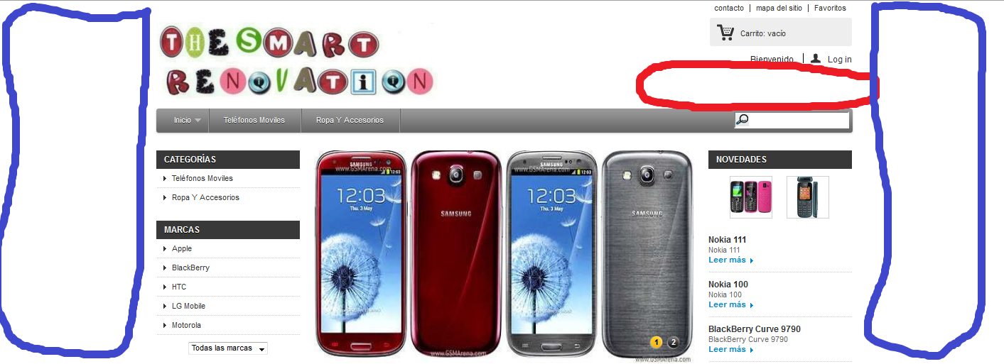 La primera quiero eliminar el espacio que hay entre el carrito y la barra de inicio, que esta encerrado en rojo.....y lo segundo quiero colocar una imagen que ocupe todo el espacio que esta en azul, pero no se las dimensiones que debe tener ni donde colocarla.