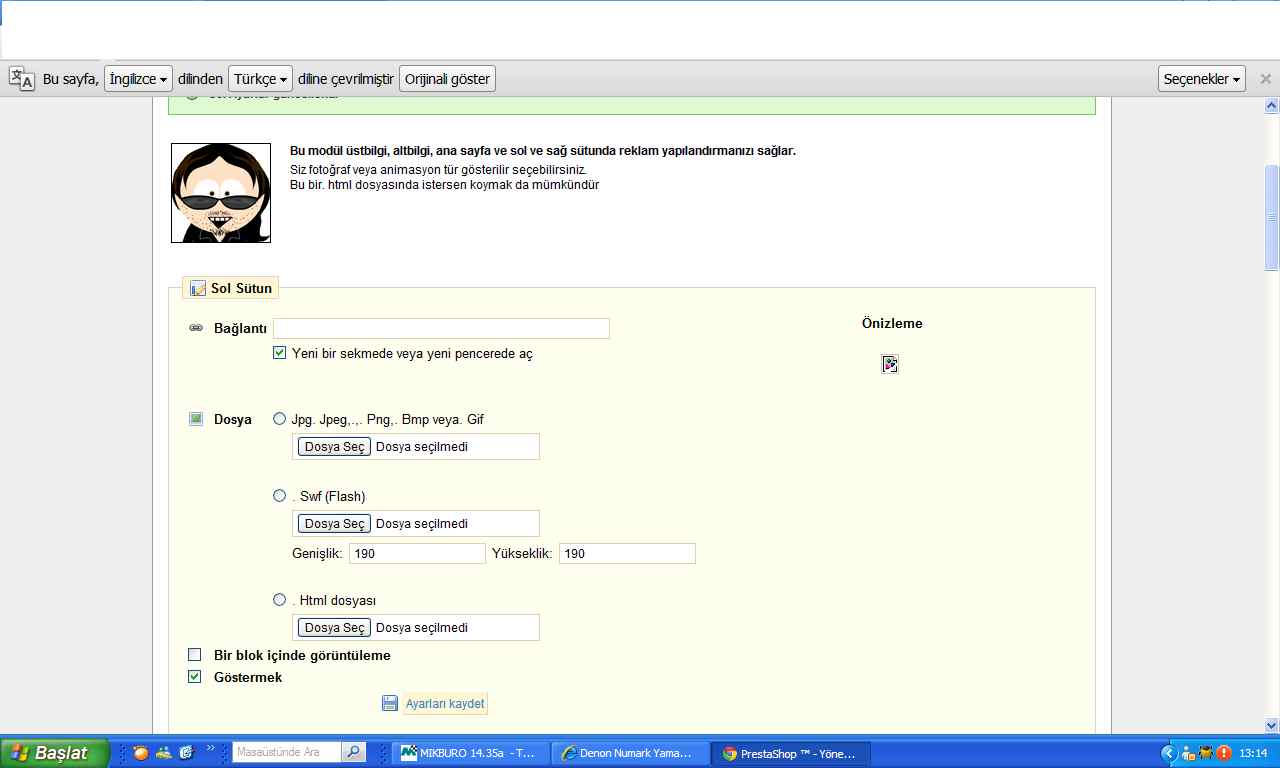 MEG Venture Posted October 30, 2012 Share Posted October 30, 2012 Modülün Back Office kodlamasında hata olmalı. Home_dir ya da module_dir kullanarak önizleme veriyolu girilmesi gerekirdi. Eğer hata yok ise prestashop kurulumunun olduğu dizin kök dizin olmayabilir. Resimden görülmüyor. Kök dizin üzerinde bir klasöre kurulduysa da bu hatayı verebilir. Link to comment Share on other sites More sharing options...