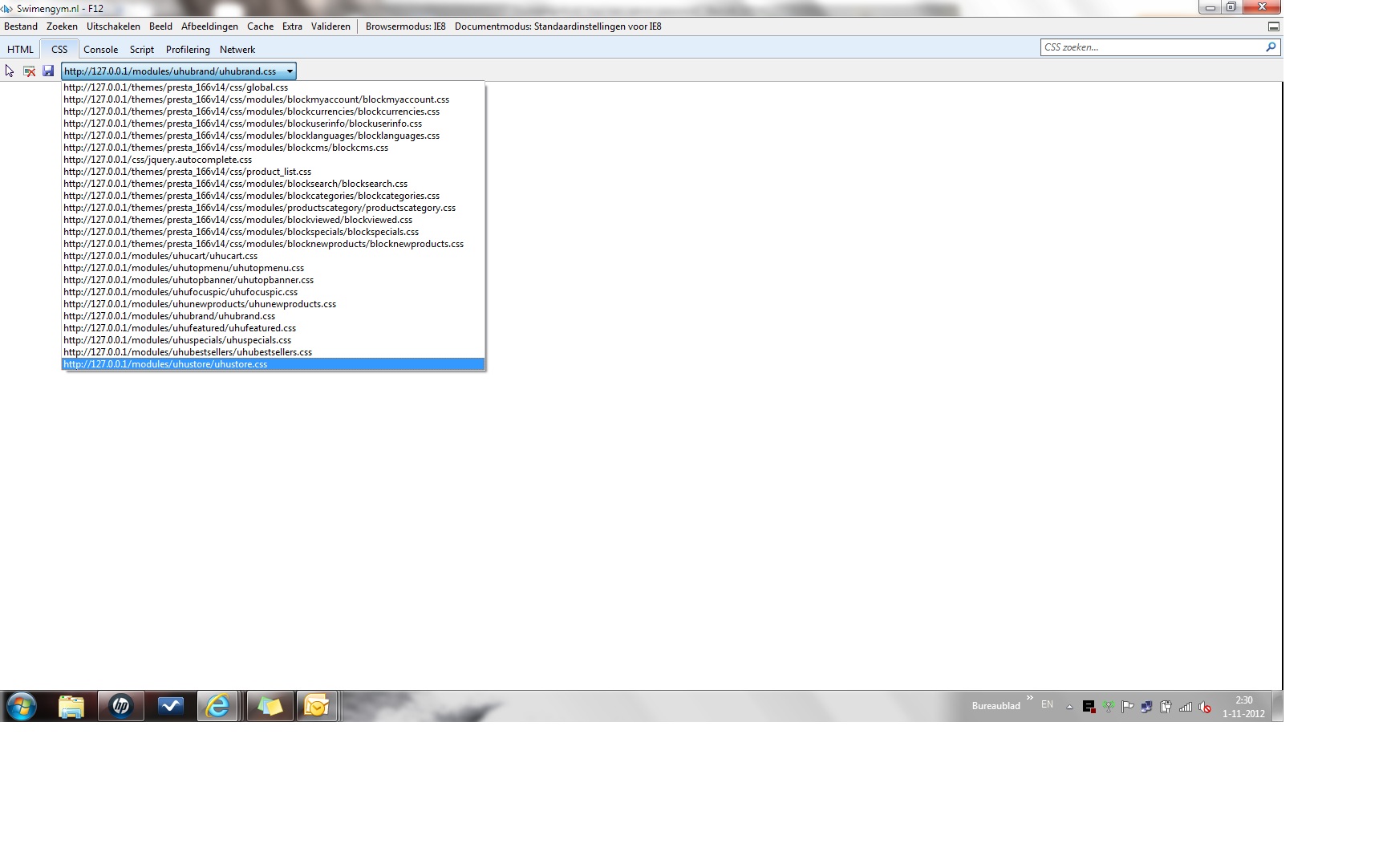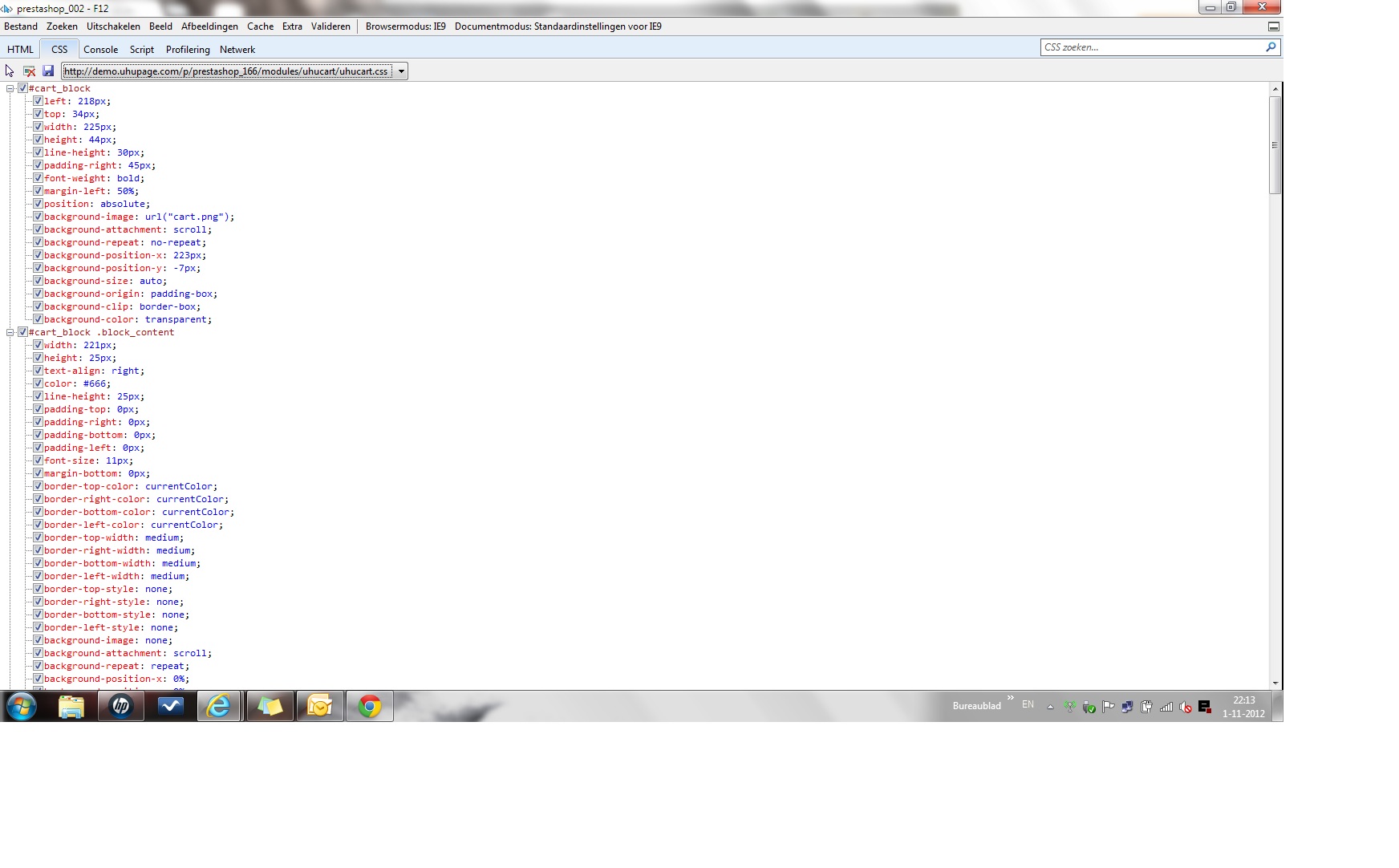 Freek Posted November 1, 2012 Author Share Posted November 1, 2012 Je kan het eens vergelijken met hoe hun het geplaatst hebben <link href="/p/prestashop_166/themes/presta_166v14/css/global.css" rel="stylesheet" type="text/css" media="all" /> <link href="/p/prestashop_166/themes/presta_166v14/css/modules/blockmyaccount/blockmyaccount.css" rel="stylesheet" type="text/css" media="all" /> <link href="/p/prestashop_166/themes/presta_166v14/css/modules/blockcurrencies/blockcurrencies.css" rel="stylesheet" type="text/css" media="all" /> <link href="/p/prestashop_166/themes/presta_166v14/css/modules/blockuserinfo/blockuserinfo.css" rel="stylesheet" type="text/css" media="all" /> <link href="/p/prestashop_166/themes/presta_166v14/css/modules/blocklanguages/blocklanguages.css" rel="stylesheet" type="text/css" media="all" /> <link href="/p/prestashop_166/themes/presta_166v14/css/modules/blockcms/blockcms.css" rel="stylesheet" type="text/css" media="all" /> <link href="/p/prestashop_166/css/jquery.autocomplete.css" rel="stylesheet" type="text/css" media="all" /> <link href="/p/prestashop_166/themes/presta_166v14/css/product_list.css" rel="stylesheet" type="text/css" media="all" /> <link href="/p/prestashop_166/themes/presta_166v14/css/modules/blocksearch/blocksearch.css" rel="stylesheet" type="text/css" media="all" /> <link href="/p/prestashop_166/themes/presta_166v14/css/modules/blockcategories/blockcategories.css" rel="stylesheet" type="text/css" media="all" /> <link href="/p/prestashop_166/themes/presta_166v14/css/modules/productscategory/productscategory.css" rel="stylesheet" type="text/css" media="all" /> <link href="/p/prestashop_166/themes/presta_166v14/css/modules/blockviewed/blockviewed.css" rel="stylesheet" type="text/css" media="all" /> <link href="/p/prestashop_166/themes/presta_166v14/css/modules/blockspecials/blockspecials.css" rel="stylesheet" type="text/css" media="all" /> <link href="/p/prestashop_166/themes/presta_166v14/css/modules/blocknewproducts/blocknewproducts.css" rel="stylesheet" type="text/css" media="all" als ik online naar http://demo.uhupage....prestashop_166/ ga en op f12 klik en de css van /modules/uhucart/uhucart.css aanklik zie ik alle opmaak instellingen van de pagina (zie bijlage). Maar als ik hetzelfde doe op 127.0.0.1/modules/uhucart/uhucart.css blijft het scherm leeg. Is dat dus de reden waarom de cart in de linkerbovenhoel dus niet weergegeven wordt op de localhost pagina. Op de localhost pagina staat nu alleen een hyperlink tekstregel zonder verdere opmaak of cart icoon (zie eerder bijlage screenprint). Kan dit komen omdat de site localhost draait en niet online? Of zijn er bepaalde instellingen/rechten van die aard dat de opmaak niet doorkomt? Link to comment Share on other sites More sharing options...