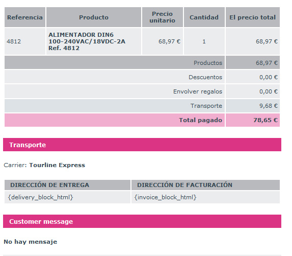 Cuando se hace un pedido, en el email al cliente llegan bien los datos. Pero en el email al administrador del site, en los campos de "Direccion de entrega" y "Direccion de Facturacion" no llegan los datos, aparecen los nombres de las variables: