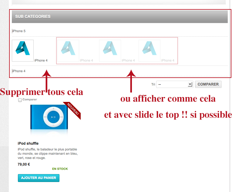 xscream_007 Posted November 1, 2012 Share Posted November 1, 2012 (edited) Bonjour à tous, voila j'aimerai sois désactiver l'affichage de "sub category" ou sois afficher la sous catégory en silde ou les afficher cote a cote et non l'une sous l'autre Voir image jointe Si vous avez une idée, ca serai d'une grande utilité. Merci Edited November 1, 2012 by mathieu gerentes (see edit history) Link to comment Share on other sites More sharing options...