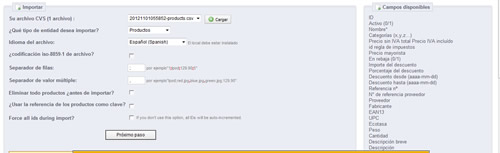 nadie Posted November 1, 2012 Share Posted November 1, 2012 Hola: has acertado en la primera parte, cambie por comas y llegue hasta la siguiente pantalla donde ya salian todos los articulos, pero a darle a importar, sale esto (bueno una lista entera de esto): A00100 (ID: 33) no se puede guardar Property Product->id_tax_rules_group is not valid y no se importa nada lo he intentado , pero me doy por perdida, incluso me puse en contacto con la gente que recomiendas y en la versión gratis tampoco Ese error, es por que tienes que fijarte, que en las filas de arriba al: id_tax_rules_group le hayas asignado un valor/es validos. Es decir, cuando importas ,debes señalar, el nombre esta columna, el id de impuesto esta otra ect... lo he intentado , pero me doy por perdida, incluso me puse en contacto con la gente que recomiendas y en la versión gratis tampoco Normalmente, no suelen dar problemas. ¿Te refieres a estos: http://www.shopping-...-migration.com/ ? PD: Pero vamos supongo que todo es posible, aunque ya te digo que mi recomendación, es por que yo he probado ese servicio de oscommerce a prestashop que ofrecen y funcionar funciona, pero vamos supongo que todo es posible. (No tengo ninguna relación con ellos) Link to comment Share on other sites More sharing options...