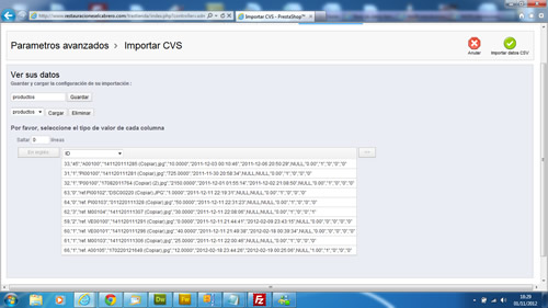 miriamgomez Posted November 1, 2012 Author Share Posted November 1, 2012 Que mal se ven las imagenes, no se aprecia mucho las imagenes ) Pero, vamos basicamente por lo que veo, no estas asignado a cada zona el valor. En tu caso, ve que tienes separado los valores por "," (comas) (Y como en prestashop, tienes que te reconozcan los valores por ";" te aparecen todos los valores amontonados.) Cuando vayas a importar, en tu caso: Separador de filas: es , Y no ; PD: Al menos eso es lo que aprecio... a modo .... "invisible", por que las imágenes no las veo bien, son muy muy pequeñas. Hola: has acertado en la primera parte, cambie por comas y llegue hasta la siguiente pantalla donde ya salian todos los articulos, pero a darle a importar, sale esto (bueno una lista entera de esto): A00100 (ID: 33) no se puede guardar Property Product->id_tax_rules_group is not valid y no se importa nada Por otro lado, prestashop lleva un importador especifico, para importar datos de una base de datos de una tienda oscommerce a Prestashop, lo puedes encontrar en la pestaña Modulos de tu tienda. lo he intentado , pero me doy por perdida, incluso me puse en contacto con la gente que recomiendas y en la versión gratis tampoco Link to comment Share on other sites More sharing options...