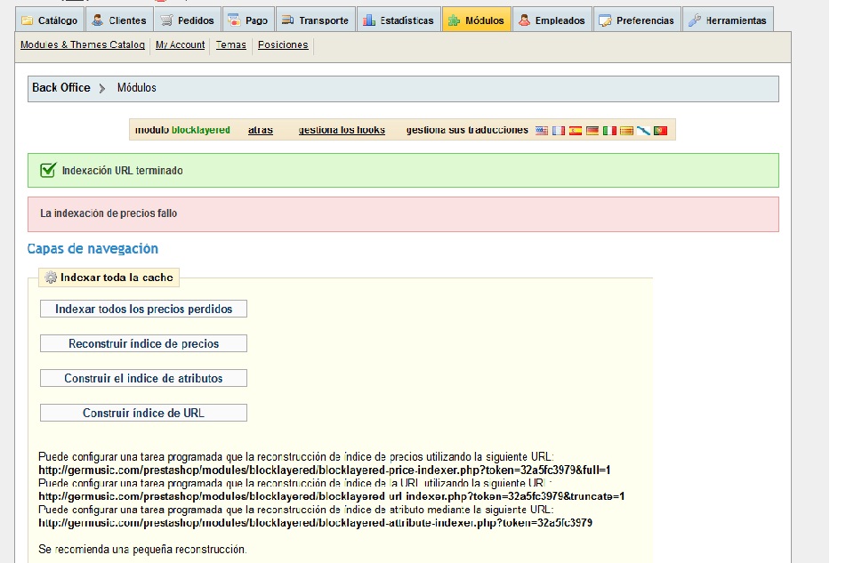 Musicmind Posted November 1, 2012 Share Posted November 1, 2012 Saludos a toda la comunidad y gracias de antemano al equipo que la conforma, gracias a ellos he podido solventar muchas dudas acerca de Prestashop. He buscado y buscado una solución a mi problema, pero despues de no encontrar nada he decidido postearlo para ver si alguien por favor puede echarme una mano. Vengo de Zencart, y he realizado una migración con el modulo Presto Changeo, todo correcto y base de datos volcada de forma correcta. El problema es cuando activo el modulo Bloque de navegación por facetas e intento indexar los precios o reconstruir el indice de precios. Al pulsar en cualquiera de estos dos cuadros obtengo a los pocos segundos el mensaje "La indexación de precios fallo", tal como se ve en la imagen. He de decir que la importación ha sido de casi 20.000 productos e intuyo que se trata de que el script no ejecuta el php el tiempo suficiente como para indexar los precios de todos los artículos. He mirado el error log de mi servidor y me da el siguiente error: [warn] mod_fcgid: stderr: PHP Fatal error: Call to undefined function memory_get_peak_usage() in /var/www/vhosts/germusic.com/httpdocs/prestashop/modules/blocklayered/blocklayered.php on line 971 Aquí la línea de código que encuentro es while ($cursor < $nb_products && (Tools::getMemoryLimit()) > memory_get_peak_usage() && $time_elapsed < $max_executiontime); Por si acaso he mirado los tiempos y límites de php.ini de mi servidor y los tengo colocados de la siguiente forma: max_execution_time = 1000 ; Maximum execution time of each script, in seconds max_input_time = -1 ; Maximum amount of time each script may spend parsing request data memory_limit = 128M ; Maximum amount of memory a script may consume La indexacióin de atributos y la del indice URL me las completa sin problemas. Mi versión de prestashop es la 1.4.8.2 y el módulo es blocklayered versión 1.9. ¿Alguien podría por favor darme alguna pista?. Mil gracias Link to comment Share on other sites More sharing options...