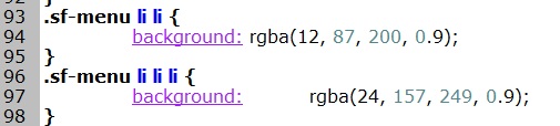 Brax971 Posted November 1, 2012 Author Share Posted November 1, 2012 Résolu!!apres des recherches j'ai trouvé la solution Il faut modifier les code RGB ( code de style) du fichier css : superfish-modified.css Fichier se trouvant dans le dossier CSS du module Block top menu Ces codes se trouvent à la ligne 95 et 98 du fichier CSS background: rgba(12, 87, 200, 0.9); } .sf-menu li li li { background: rgba(24, 157, 249, 0.9); } .sf-menu a:focus, .sf-menu a:hover, .sf-menu a:active { background: transparent url(../img/bg_blocktopmenu_li_hover.png) repeat-x 0 0; 1 Link to comment Share on other sites More sharing options...