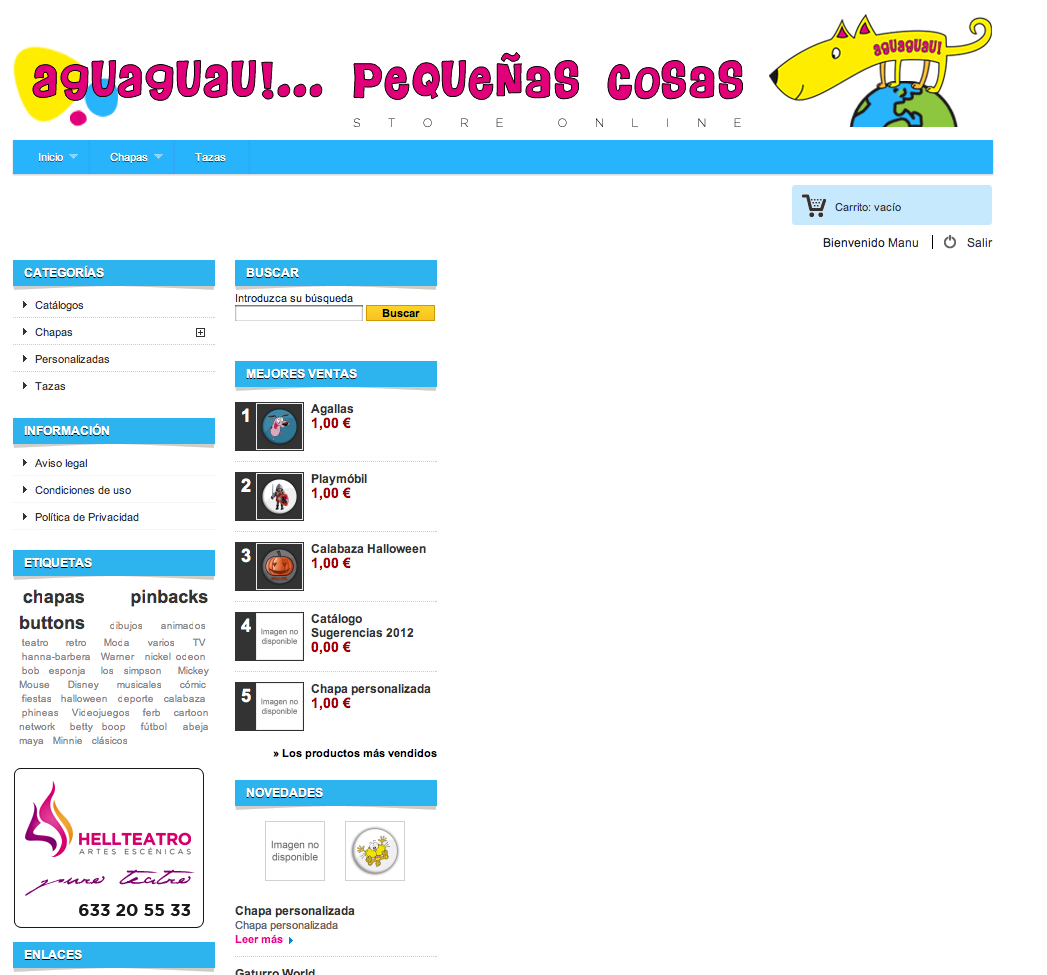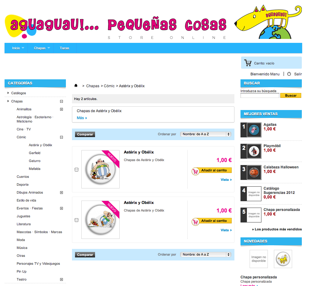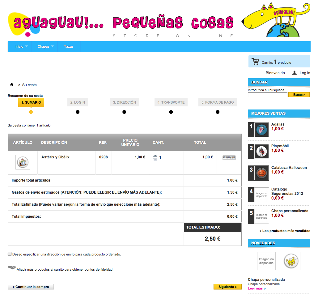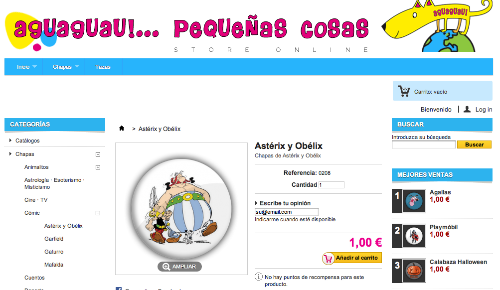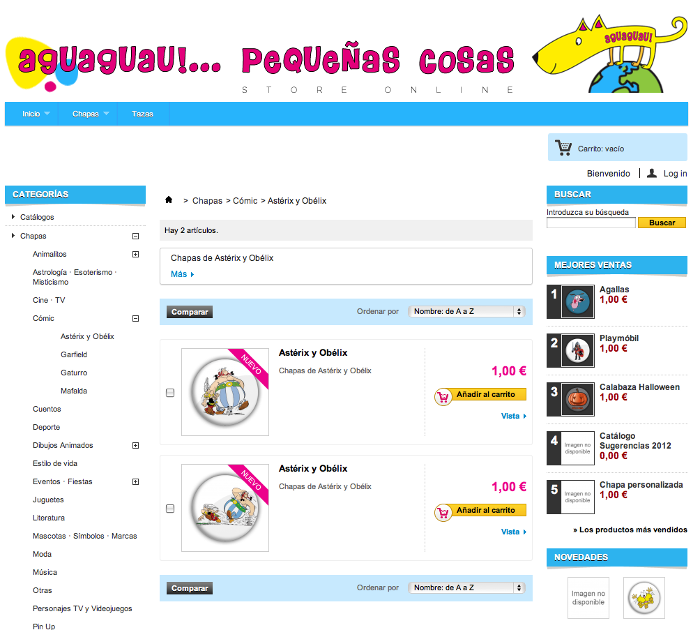 MANUCOSTA Posted November 2, 2012 Author Share Posted November 2, 2012 Por cierto, en mi tienda se produce una especie de error (supongo que habrá más, pero aún no he dado con ellos) pero no sé dónde puedo postearlo; lo hago aquí y si algún moderador lo cree conveniente, lo puede mover a donde corresponda. Explicarlo me resulta complicado… Entramos en la tienda y vamos a (por ejemplo) Categorías>Chapas>Cómic>Astérix y Obélix Si NO estamos logueados y picamos en 'Añadir al carrito' de cualquier producto, nos lleva aquí: Tengo habilitada la 'compra directa' sin necesidad de registro previo, por lo que debería mostrar la cesta con el producto seleccionado, es decir… Vayamos al mismo sitio pero seleccionemos uno de los artículos, para que muestre más detalles, tal que así: Si aquí picáramos en 'Añadir al carrito' SÍ nos lleva a la cesta y nos muestra el artículo: Estando registrado, si entramos en la tienda y vamos a (como antes) Categorías>Chapas>Cómic>Astérix y Obélix Y picamos en 'Añadir al carrito' de cualquier producto, nos lleva aquí: Elimina todo el contenido central y junta las dos columnas. ¿Alguien da mas? No sé si el problema es de la versión con la que trabajo (1.5.0.17) o sólo es mío. Gracias de nuevo a todos. Link to comment Share on other sites More sharing options...