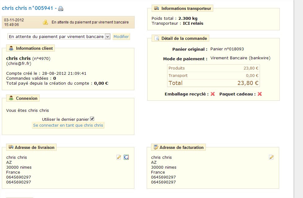 chrisdig51 Posted November 3, 2012 Share Posted November 3, 2012 bonjour, je rencontre un problème avec le module exapaq. (module version 1.3) lorsque j'installe ce module je n'ai aucun souci, lorsque je dois choisir mon transporteur je n'ai aucun problème ici relais s'affiche bien, je peux donc sélectionner mon lieu de livraison (jusque la RAS) cependant quand un client choisi ce mode de livraison dans le back office j'ai seulement l'info comme quoi le transporteur est bien ici relais mais je n'ai aucune info sur le lieu de livraison normalement l'adresse de livraison devrai être celle choisie par le client mais la elle reste identique a l'adresse de facturation. je mets une image pour compléter mon explication. avez vous déjà rencontré ce problème ou alors avez vous une solution svp? Merci a vous Link to comment Share on other sites More sharing options...