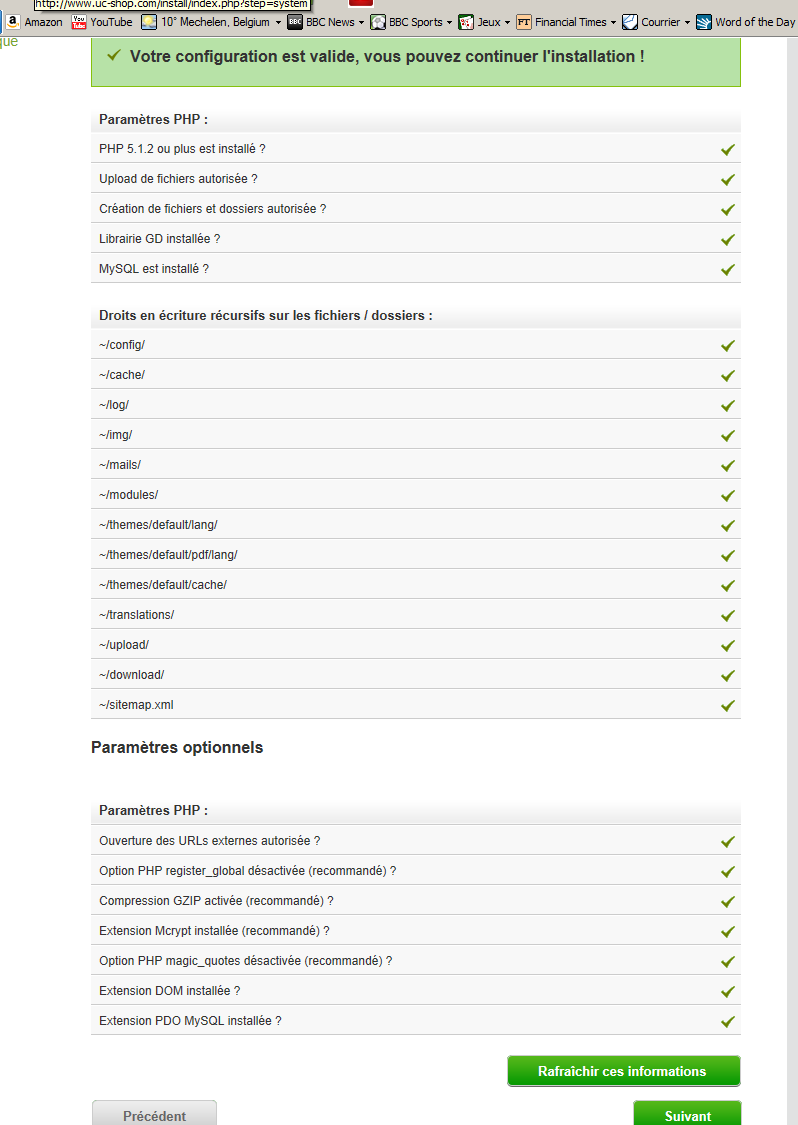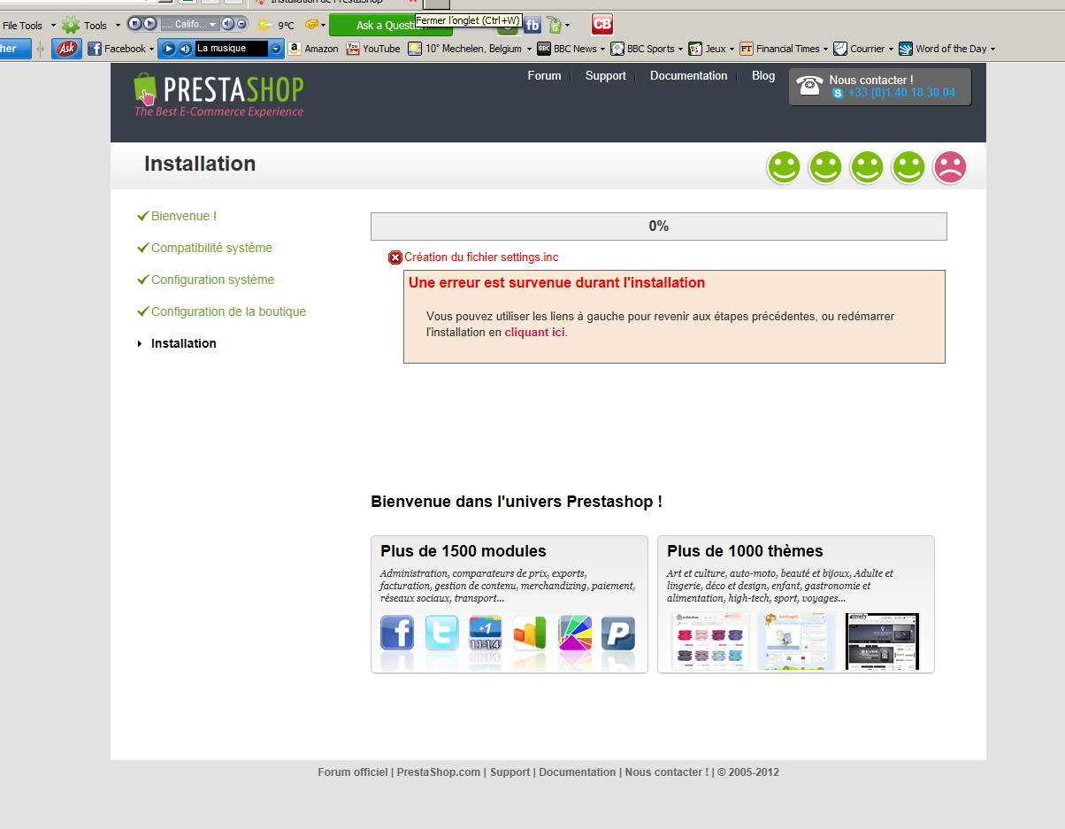 bluedream Posted November 5, 2012 Author Share Posted November 5, 2012 lors de l'installation de prestashop 1.5 il me dit en fin d'installation que le fichier setting.inc est en erreur........ or tout est bon dans l'installation....... qui peut m'aider? Link to comment Share on other sites More sharing options...