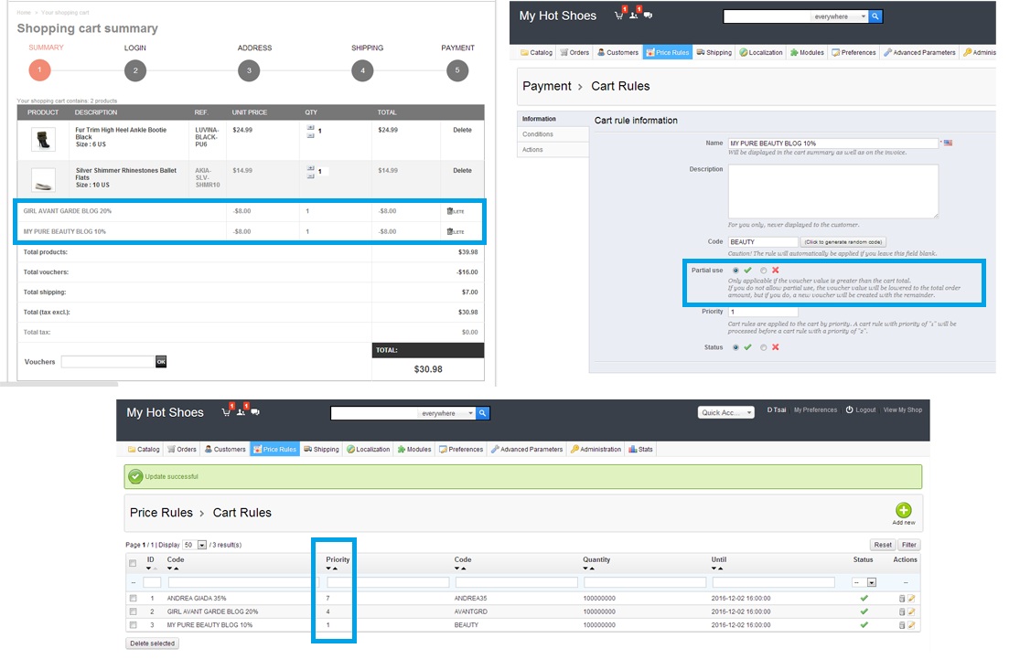 darice.mhs Posted November 5, 2012 Share Posted November 5, 2012 (edited) I'm trying to create coupons for my store. I have approx. 60 I need to create, most of which are a discount for the entire store minus a few sales categories. I was able to create a few and tried to run a test. However, a few things came to my attention that I need to find help with. When I add the first coupon, everything runs smoothly, but when I add in a second coupon, it takes off the same amount as the first coupon as you can see in the attachment. What I want it to do is to take the 10% coupon off the total order first, then apply a second coupon at 20% for the remainder of the order. As you can see in the attachment, I have put a priority on the 10% coupon at 1, and 20% at 4, which I thought would apply the discounts according, but it doesn't seem to be the case. Lastly, I am a little confused about the partial use checkbox. I do not wish for a new coupon to be created, so I have checked the box, but I'm not sure if this affects the aforementioned issues. Another questions is: how do I configure the vouchers to not be available for certain categories: i.e. Hot Sales and it's subcategories, as well as the specials block (daily deals) with its own specific pricing schedule? PLEASE HELP! THANKS! Also i'm on version: 1.5.2.0 Edited November 5, 2012 by darice.mhs (see edit history) Link to comment Share on other sites More sharing options...