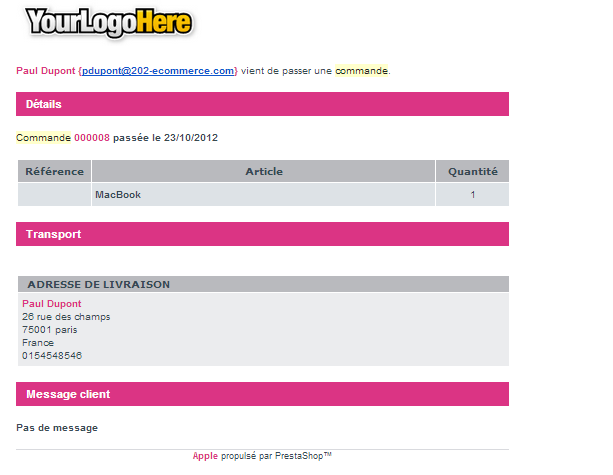 202-Ecommerce Posted November 7, 2012 Share Posted November 7, 2012 Bonjour à tous ! Je tiens à vous présenter notre dernier module pour du dropshipping, il fonctionne de la version 1.3.0.1 jusqu'à la dernière version 1.5.2.0 ! Les fonctionnalités de ce module sont : Réglages envoi des mails automatiques : • Liste de tous les fournisseurs présents dans votre catalogue. • Activer/Désactiver l’envoi d’e-mail selon fournisseurs. • Ajout de l’adresse e-mail du fournisseur. • Activer/Désactiver visibilité de l’adresse e-mail du client final. Vous pouvez ainsi permettre à vos fournisseurs d’envoyer un email à vos clients, ou pas. • Activer/Désactiver visibilité adresse de livraison du client final. Vous pouvez ainsi permettre à vos fournisseurs d’envoyer le produit directement à votre client, ou pas. Le mail envoyé au fournisseur contient (selon les réglages) : • Le nom et prénom du client • L’adresse e-mail du client • Le numéro de commande • La référence du produit • Le nom de l’article • La quantité désirée • Le mode de transport • L’adresse de livraison • Le message client Vous pouvez notre module ici : http://addons.prestashop.com/fr/transport-logistique-livraison-modules-prestashop/6321-Envoi-mail-automatique-fournisseur---Dropshipping.html Merci d'avoir pris de votre temps pour lire mon post Link to comment Share on other sites More sharing options...