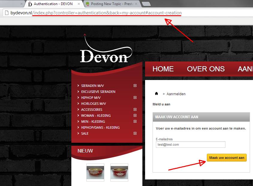 drw026 Posted November 8, 2012 Share Posted November 8, 2012 (edited) Beste leden, De volgende probleem ben ik tegengekomen. Bij de keuze Maak account aan en Al geregistreerd kom ik na het invoeren van het veld e-mail (onder Maak account) niet verder. De scherm blijft staan zonder foutmeldingen te geven. Het enige wat veranderd is de URL: van /index.php?controller=authentication&back=my-account naar /index.php?controller=authentication&back=my-account#account-creation Ik heb gekeken naar de oplossing van Wim (zie: http://www.prestasho...-aanmaken-1510/), echter heb ik de optie Phone Number niet eens staan onder Preference > Customers. Zijn er nog andere oplossingen ? Oh, ik gebruik PrestaShop™ 1.5.0.17. Edited November 8, 2012 by drw026 (see edit history) Link to comment Share on other sites More sharing options...