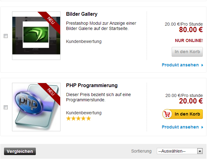 Systemcheck82 Posted November 9, 2012 Author Share Posted November 9, 2012 Ich habe es mir angesehen. Es ist realisierbar, allerdings müssen 2 Dateien angepasst werden. /controller/productcontroller.. Und eben die templates.. Hier product-list.tpl. Gibt es überhaupt Interessenten? Danke fürs verschieben Conny.. Link to comment Share on other sites More sharing options...