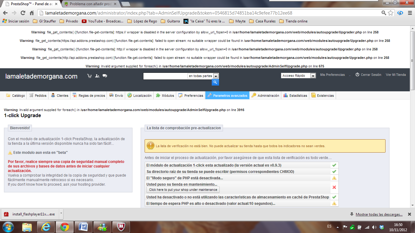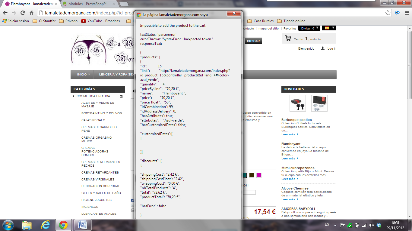 No sé que he tocado, pero el caso es que cuando intento añadir un producto (cualquiera) al carrito, me sale un texto de "Imposible add producto to the....". Os adjunto imagen con lo que me sale.