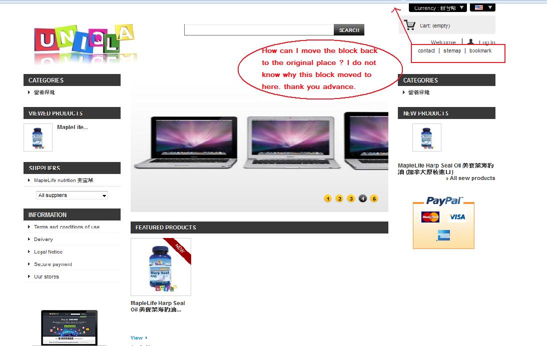 jensen_tw Posted November 12, 2012 Author Share Posted November 12, 2012 [solved] 1.In Back Office 2.Modules/positions/Top of Pages 3.find "固定鏈接區域 (fixed link area)" [sorry, my prestashop version is Chinese, so I am not sure what's the really english name of "固定鏈接區域", anyway just find a link image] 4.you can move it up or down to where you want Link to comment Share on other sites More sharing options...