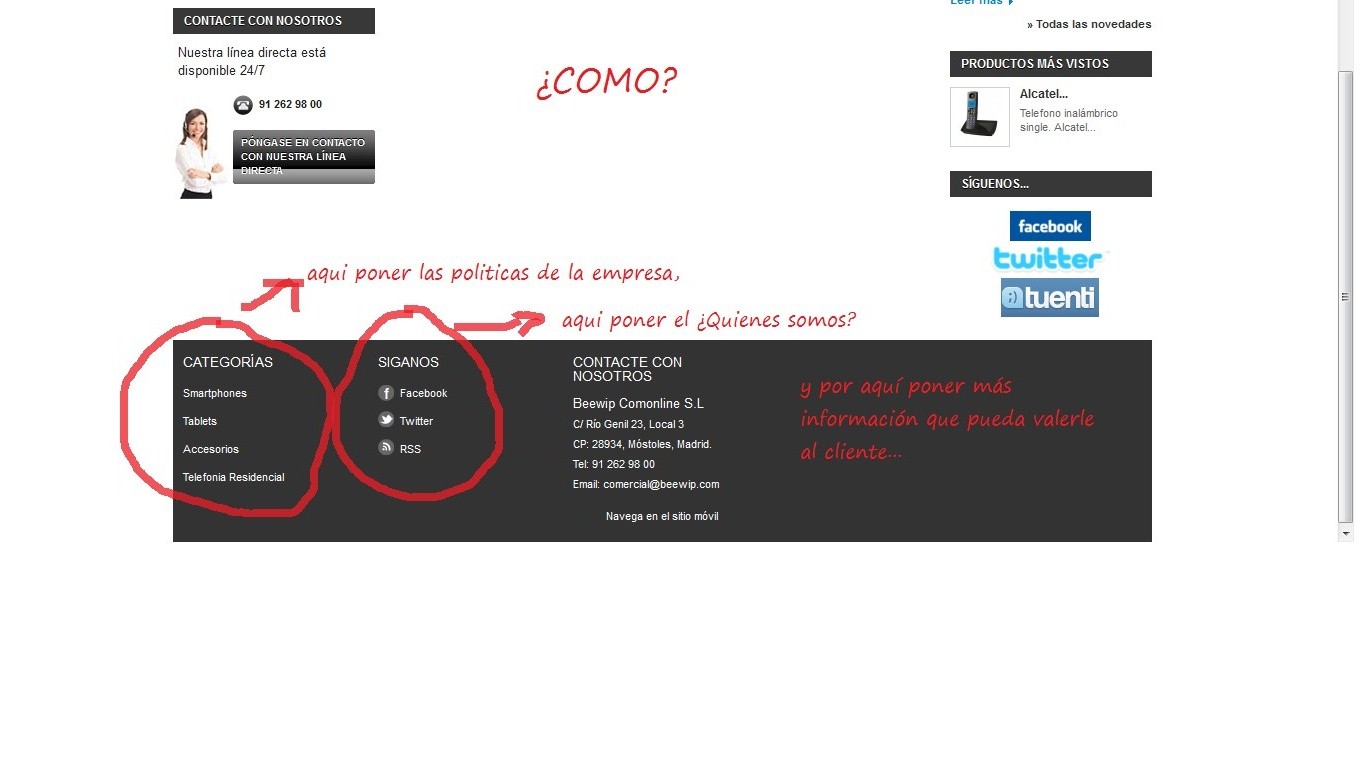 seteoner Posted November 13, 2012 Share Posted November 13, 2012 Buenas a todos, día tras día, cada cosa que miro y quiero modificar... me siento más perdido que nada. A ver quien me ayuda: Quiero modificar el pie de pagina (Creo que le llamais footer), y en vez de que salgan las categorias, lo de siguenos en facebook, twitter y RSS y poner el tipico, ¿Quienes somos? El Faq de la página, las politicas de envío, y todos esos rollos... ¿Que modulo modifico para eso? Si es que es un modulo... Dejo una foto para que os imagineis mejor lo que quiero hacer! Gracias a todos!!! La verdad, SIN VOSOTROS NO HABRIA HECHO NADA!!! Link to comment Share on other sites More sharing options...