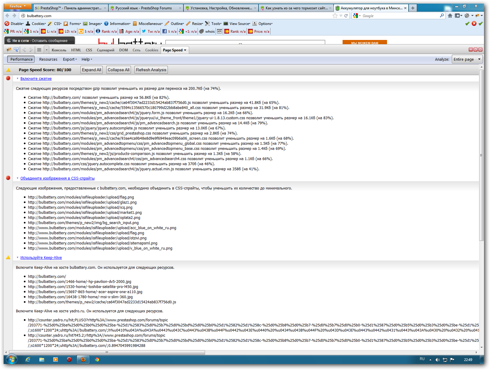 Вот скрины анализа 1-ой страницы Вашего сайта. Вообще не плохо, но можно включить ККК сжатие в Настройки --> Производительность. Включите все, кроме Опасное HTML сжатие.