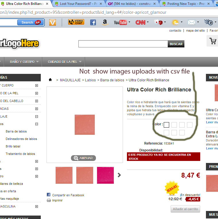 construmet4 Posted November 18, 2012 Share Posted November 18, 2012 No se muestran las imágenes miniatura en el selector de atributos color de los productos despues de la importación de las combinaciones por medio csv Subo una imagen de muestra para que podáis entender mejor que pasa. Esas mismas imágenes son importadas correctamente dentro de las combinaciones de los productos, pero no se ve en los valores de los atributos de prestashop. Si subo las imágenes mediante el formulario de los valores de atributos, si se ven bien las miniaturas, pero tengo más de 600 referencias con colores y nos volveríamos locos. ¿Alguna idea? Link to comment Share on other sites More sharing options...