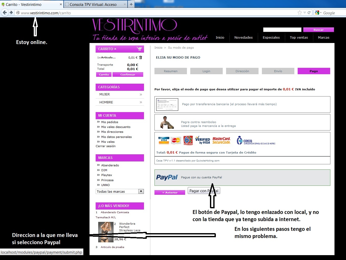 valerotarazona Posted November 19, 2012 Share Posted November 19, 2012 Buenas tardes, estoy intentando configurar el Paypal, y me está pasando una cosa un poco estraña. Cuendo selecciono en la forma de pago Paypal, este botón me lleva a la dirección: http://localhost/modules/paypal/payment/submit.php y no a: http://www.vestirintimo.com/modules/paypal/payment/submit.php como tendría que ser. Este error se me repite en los siguientes pasos. Por favor, si alguien sabe que estoy haciendo mal, que me lo diga, estoy pendiente de abrir la tienda, solo a fata de esto. Os pongo una captura para que lo veais, y si no podeis ir a www.vestirintimo.com, y probar. gracias Un saludo Link to comment Share on other sites More sharing options...