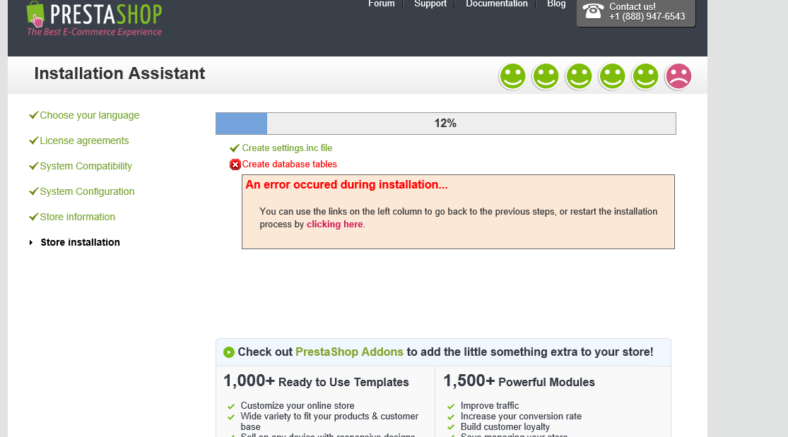 rnmosaic Posted July 29, 2013 Share Posted July 29, 2013 Hi Pascal, I am a newbie to Prestashop and have the same trouble. But in my case I came till 12% and then installation fails. It happened over 20 times now and my hosting provider is dreamhost. See screen shot attached. I checked the permissions from file zilla and set all folders and files to be at 777 Any suggestions on how to get this resolved ? Thanks Mosaic Link to comment Share on other sites More sharing options...