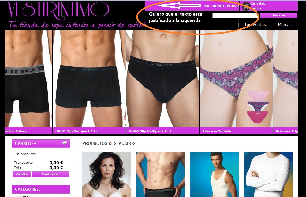 valerotarazona Posted November 27, 2012 Share Posted November 27, 2012 (edited) Hola de nuevo, una vez mas tengo que echar mano de vosotros, ya que despúes de mucho probar, el texto del módulo de Mi cuenta no consigo que se justifique a la izquierda, y no queda bien. La tienda es www.vestirintimo.com, y os mando una captura de pantalla. Muchas gracias Un saludo Edited December 3, 2012 by valerotarazona (see edit history) Link to comment Share on other sites More sharing options...