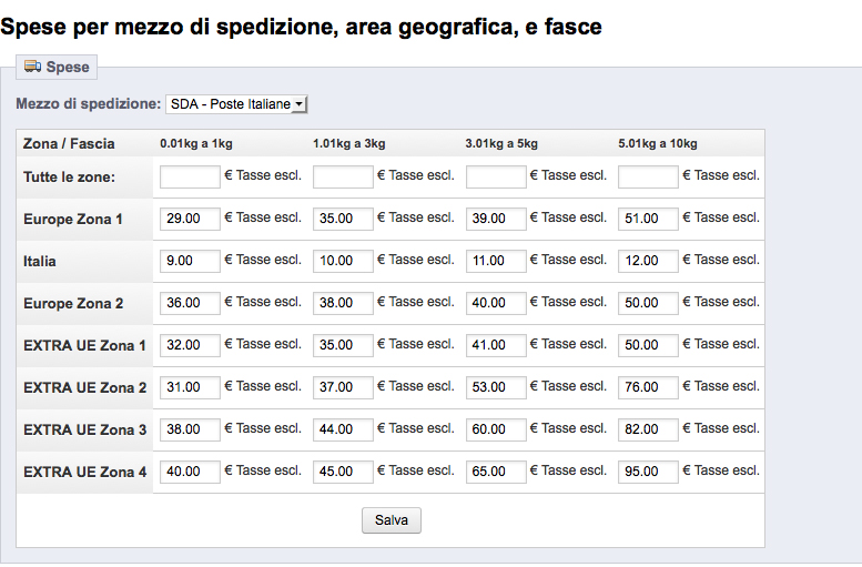 ertos982 Posted November 27, 2012 Share Posted November 27, 2012 Ciao ragazzi ho un problema nel modulo di configurazione delle spedizioni, vorrei sapere se ciò che ho fatto va bene. Allora ho inserito 7 zone (Italia - EUROPA zona 1 - EUROPA zona 2 - EXTRA UE zona 1 - EXTRA UE zona 2 - EXTRA UE zona 3- EXTRA UE zona 4) Ho inserito 4 fasce di peso: 0.01-1.00 kg; 1.01-3.00 kg 3.01-5.00 kg 5.01-10.00 kg In queste fasce ho inserito i costi di spedizione come potete vedere nell'immagine Nelle zone ho inserito le nazioni, per se vado nel carrello del mio sito non mi calcola il costo, a volta mi appare gratis, a volte mi appare 12 euro... pero mai mi appare la cifra giusta Ho sbagliato qualcosa nella selezione delle zone? Link to comment Share on other sites More sharing options...